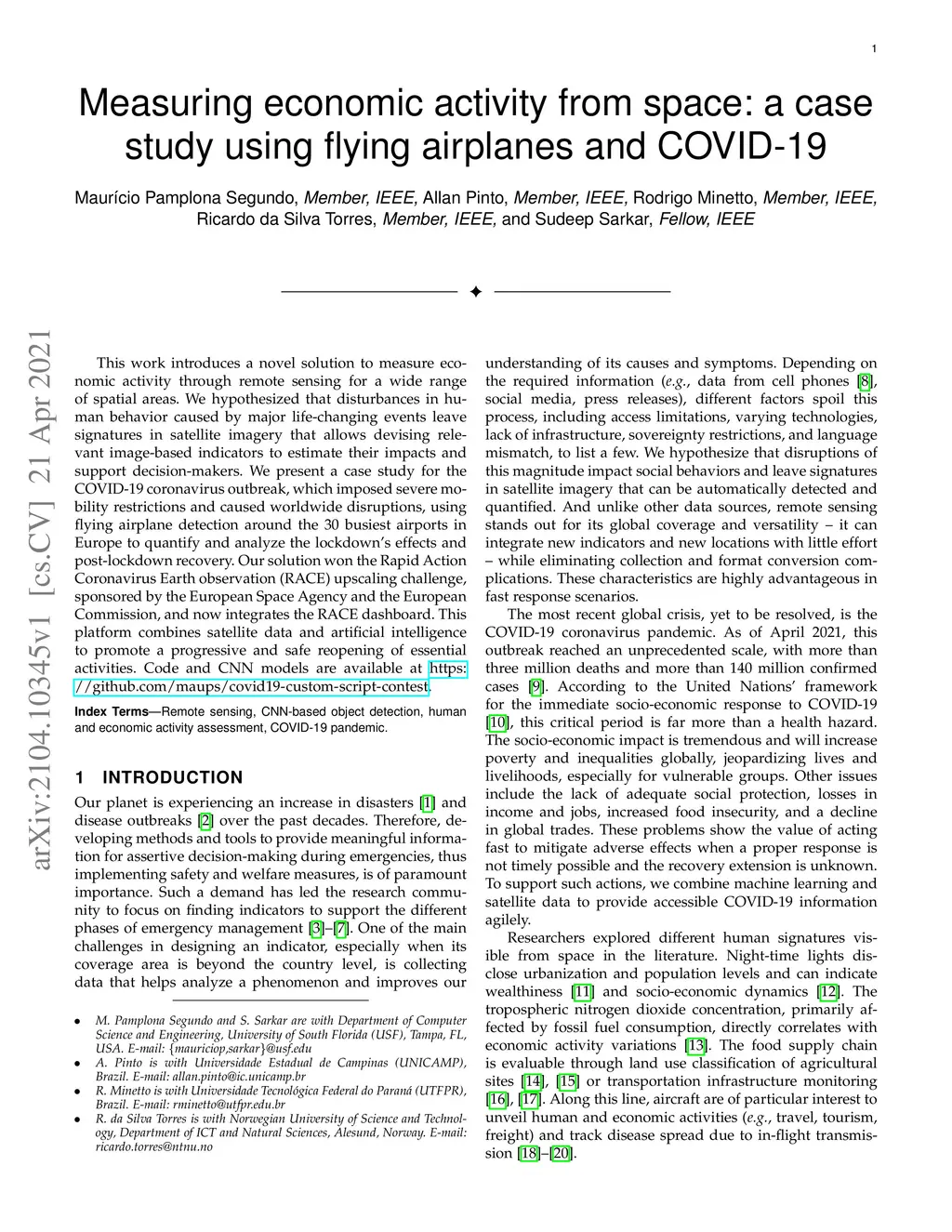 This work introduces a novel solution to measure economic activity through remote sensing for a wide range of spatial areas. We hypothesized that disturbances in human behavior caused by major life-changing events leave signatures in satellite imagery that allows devising relevant image-based indicators to estimate their impacts and support decision-makers. We present a case study for the COVID-19 coronavirus outbreak, which imposed severe mobility restrictions and caused worldwide disruptions, using flying airplane detection around the 30 busiest airports in Europe to quantify and analyze the lockdown's effects and post-lockdown recovery. Our solution won the Rapid Action Coronavirus Earth observation (RACE) upscaling challenge, sponsored by the European Space Agency and the European Commission, and now integrates the RACE dashboard. This platform combines satellite data and artificial intelligence to promote a progressive and safe reopening of essential activities. Code and CNN models are available at https://github.com/maups/covid19-custom-script-contest