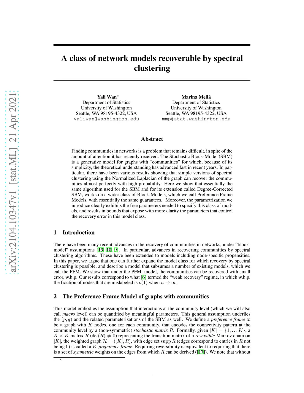 Finding communities in networks is a problem that remains difficult, in spite of the amount of attention it has recently received. The Stochastic Block-Model (SBM) is a generative model for graphs with "communities" for which, because of its simplicity, the theoretical understanding has advanced fast in recent years. In particular, there have been various results showing that simple versions of spectral clustering using the Normalized Laplacian of the graph can recover the communities almost perfectly with high probability. Here we show that essentially the same algorithm used for the SBM and for its extension called Degree-Corrected SBM, works on a wider class of Block-Models, which we call Preference Frame Models, with essentially the same guarantees. Moreover, the parametrization we introduce clearly exhibits the free parameters needed to specify this class of models, and results in bounds that expose with more clarity the parameters that control the recovery error in this model class.