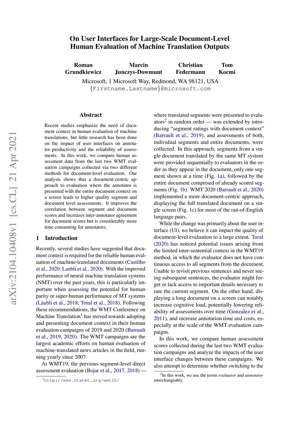 Recent studies emphasize the need of document context in human evaluation of machine translations, but little research has been done on the impact of user interfaces on annotator productivity and the reliability of assessments. In this work, we compare human assessment data from the last two WMT evaluation campaigns collected via two different methods for document-level evaluation. Our analysis shows that a document-centric approach to evaluation where the annotator is presented with the entire document context on a screen leads to higher quality segment and document level assessments. It improves the correlation between segment and document scores and increases inter-annotator agreement for document scores but is considerably more time consuming for annotators.