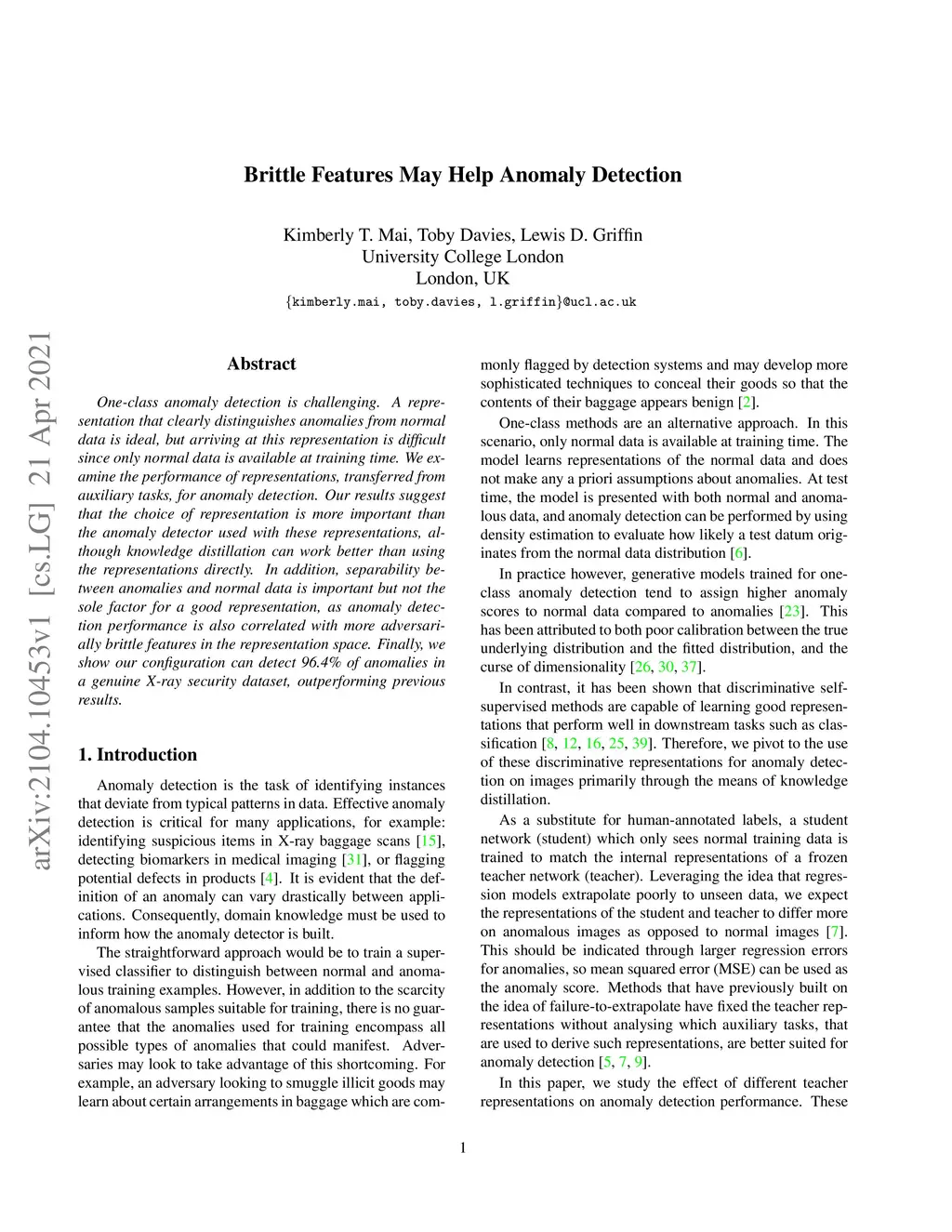 One-class anomaly detection is challenging. A representation that clearly distinguishes anomalies from normal data is ideal, but arriving at this representation is difficult since only normal data is available at training time. We examine the performance of representations, transferred from auxiliary tasks, for anomaly detection. Our results suggest that the choice of representation is more important than the anomaly detector used with these representations, although knowledge distillation can work better than using the representations directly. In addition, separability between anomalies and normal data is important but not the sole factor for a good representation, as anomaly detection performance is also correlated with more adversarially brittle features in the representation space. Finally, we show our configuration can detect 96.4% of anomalies in a genuine X-ray security dataset, outperforming previous results.