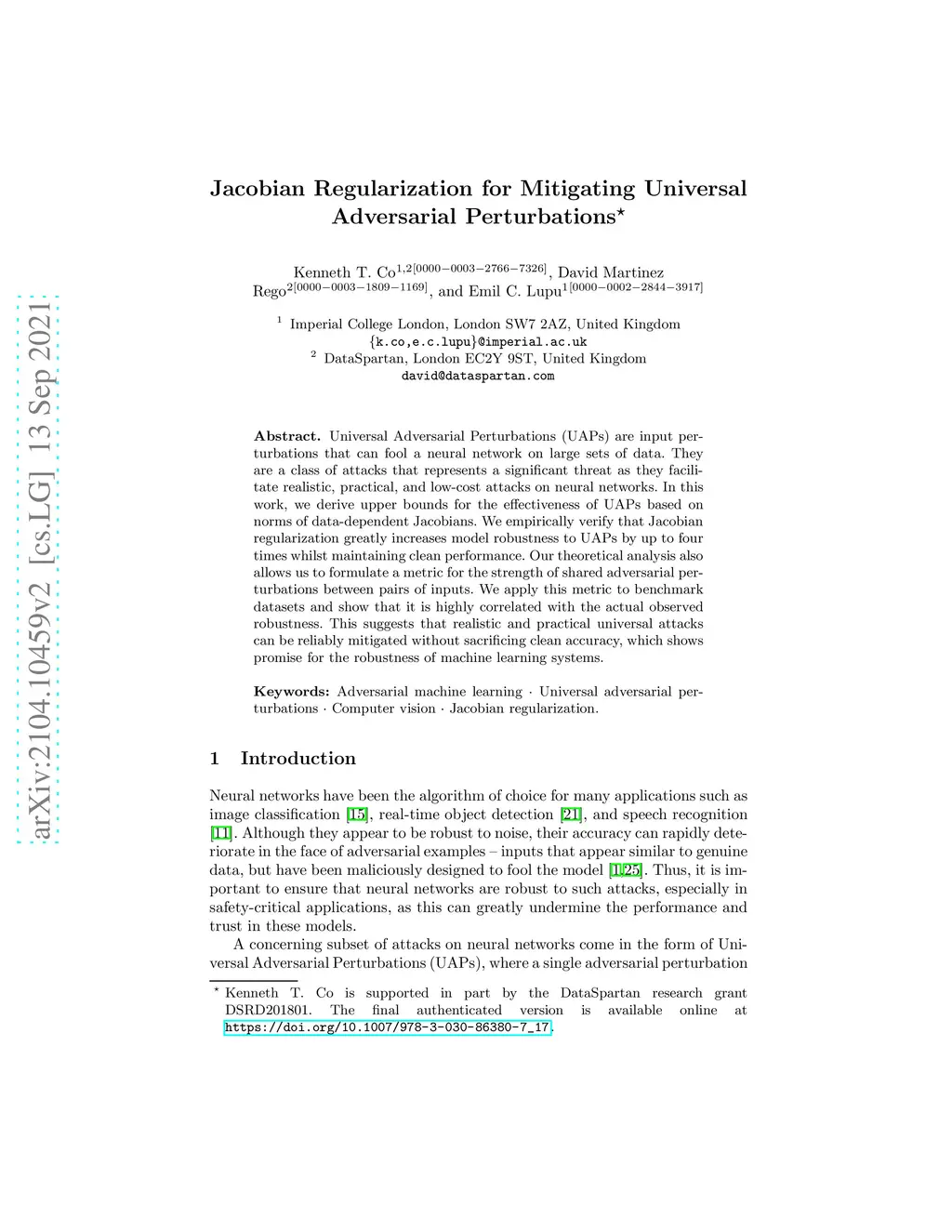 Universal Adversarial Perturbations (UAPs) are input perturbations that can fool a neural network on large sets of data. They are a class of attacks that represents a significant threat as they facilitate realistic, practical, and low-cost attacks on neural networks. In this work, we derive upper bounds for the effectiveness of UAPs based on norms of data-dependent Jacobians. We empirically verify that Jacobian regularization greatly increases model robustness to UAPs by up to four times whilst maintaining clean performance. Our theoretical analysis also allows us to formulate a metric for the strength of shared adversarial perturbations between pairs of inputs. We apply this metric to benchmark datasets and show that it is highly correlated with the actual observed robustness. This suggests that realistic and practical universal attacks can be reliably mitigated without sacrificing clean accuracy, which shows promise for the robustness of machine learning systems.