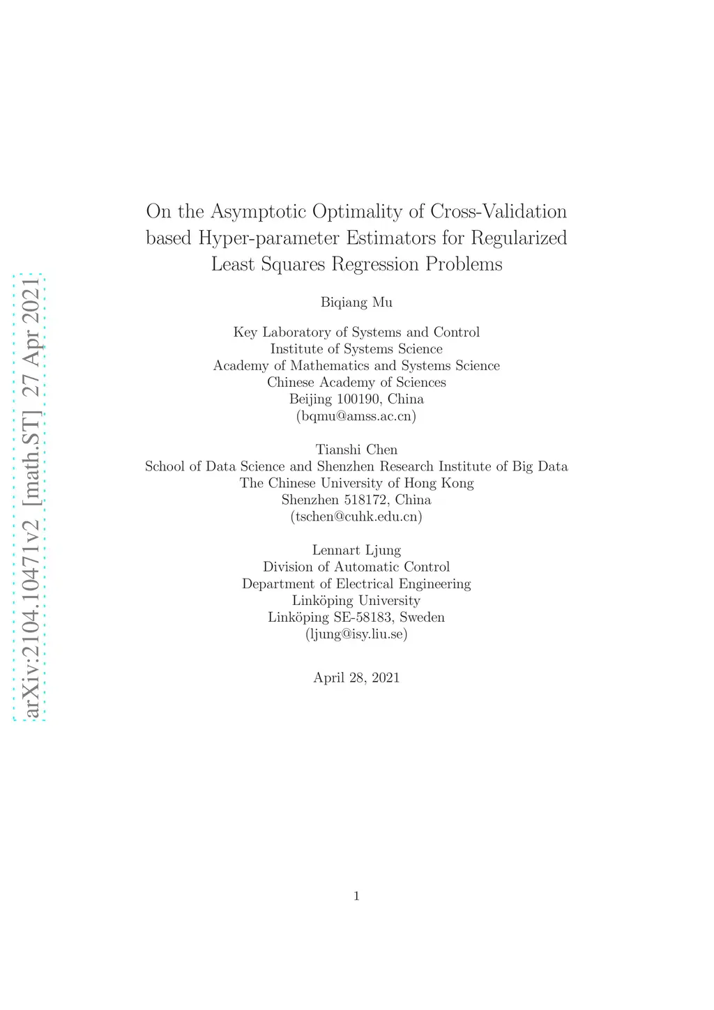 On the Asymptotic Optimality of Cross-Validation based Hyper-parameter