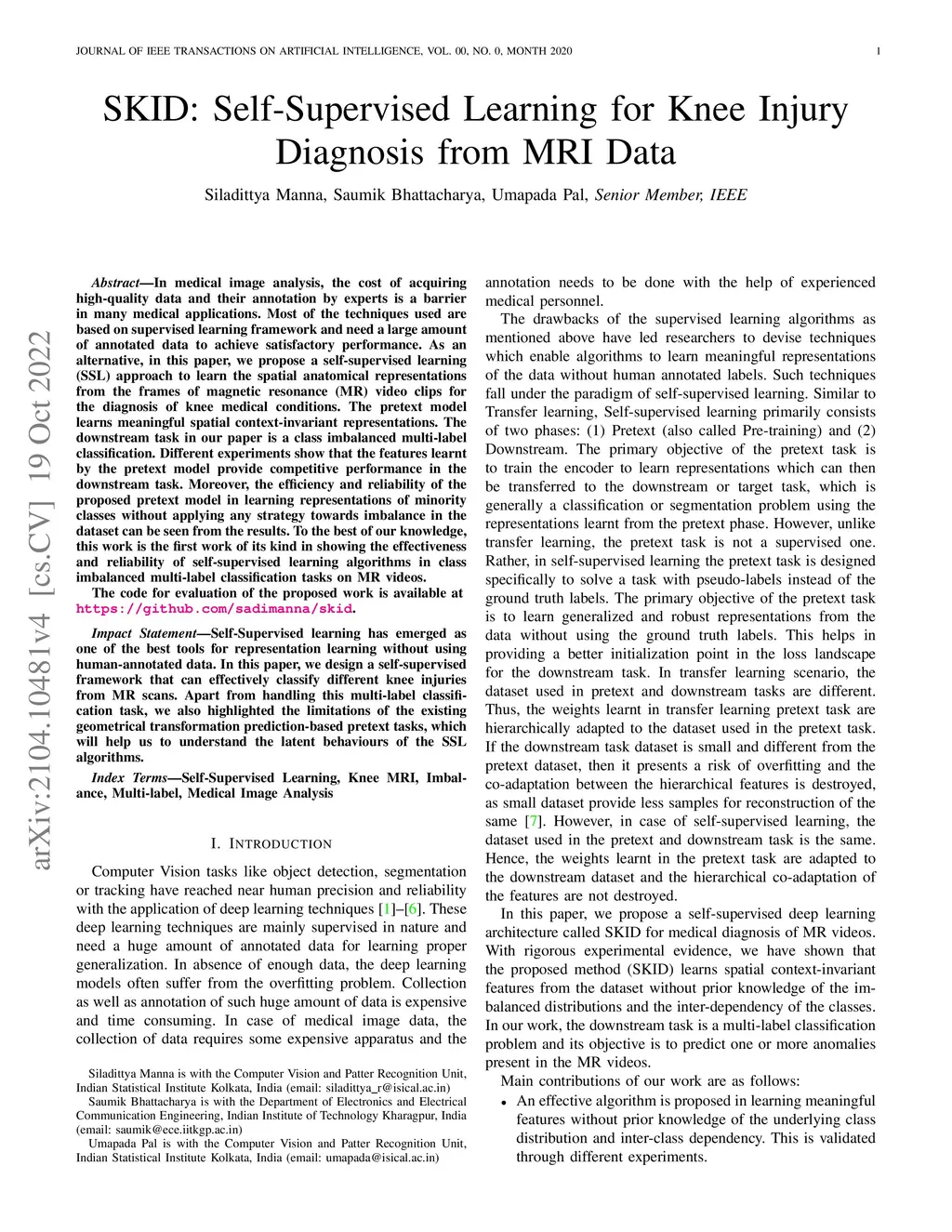 SKID: Self-Supervised Learning for Knee Injury Diagnosis from MRI Data