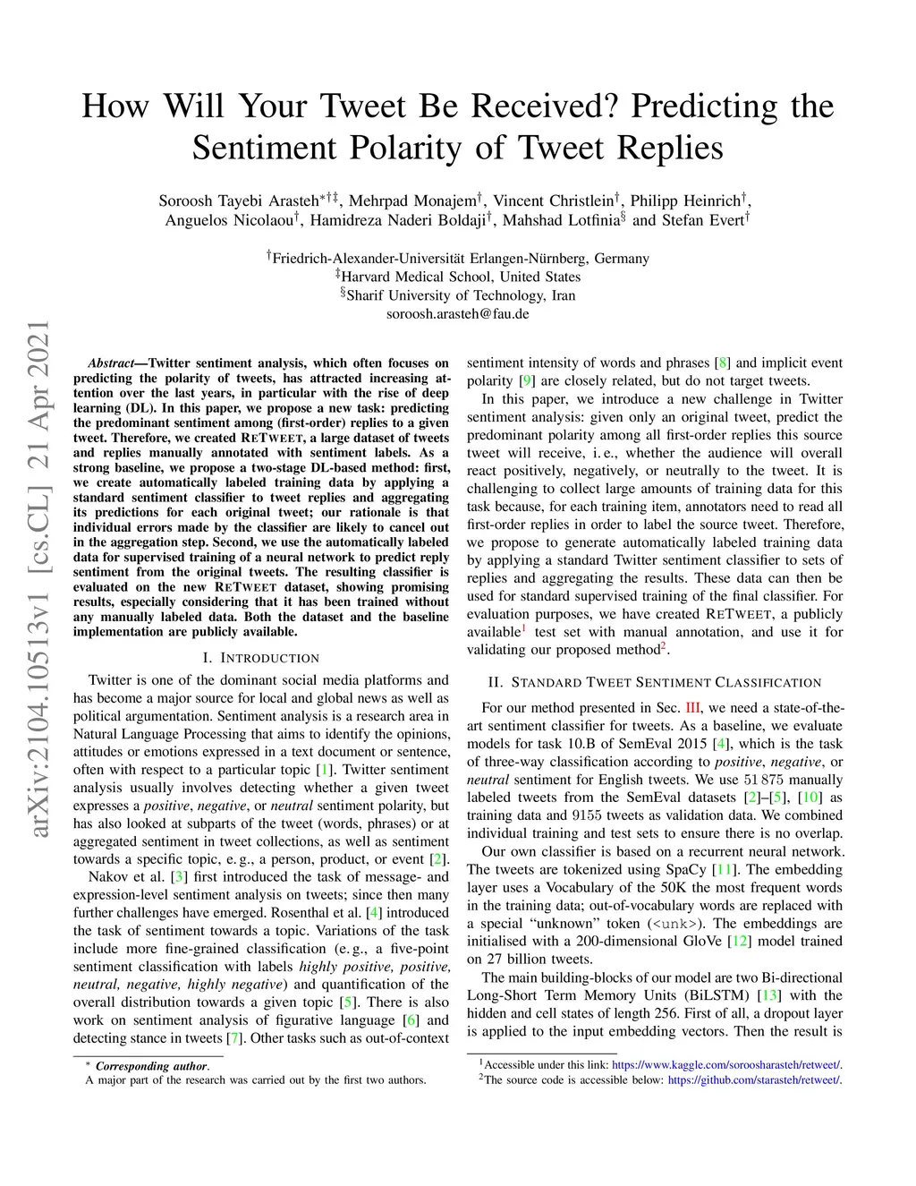 Twitter sentiment analysis, which often focuses on predicting the polarity of tweets, has attracted increasing attention over the last years, in particular with the rise of deep learning (DL). In this paper, we propose a new task: predicting the predominant sentiment among (first-order) replies to a given tweet. Therefore, we created RETWEET, a large dataset of tweets and replies manually annotated with sentiment labels. As a strong baseline, we propose a two-stage DL-based method: first, we create automatically labeled training data by applying a standard sentiment classifier to tweet replies and aggregating its predictions for each original tweet; our rationale is that individual errors made by the classifier are likely to cancel out in the aggregation step. Second, we use the automatically labeled data for supervised training of a neural network to predict reply sentiment from the original tweets. The resulting classifier is evaluated on the new RETWEET dataset, showing promising results, especially considering that it has been trained without any manually labeled data. Both the dataset and the baseline implementation are publicly available.