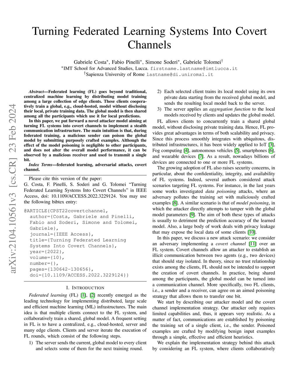 Federated learning (FL) goes beyond traditional, centralized machine learning by distributing model training among a large collection of edge clients. These clients cooperatively train a global, e.g., cloud-hosted, model without disclosing their local, private training data. The global model is then shared among all the participants which use it for local predictions. In this paper, we put forward a novel attacker model aiming at turning FL systems into covert channels to implement a stealth communication infrastructure. The main intuition is that, during federated training, a malicious sender can poison the global model by submitting purposely crafted examples. Although the effect of the model poisoning is negligible to other participants, and does not alter the overall model performance, it can be observed by a malicious receiver and used to transmit a single bit.
