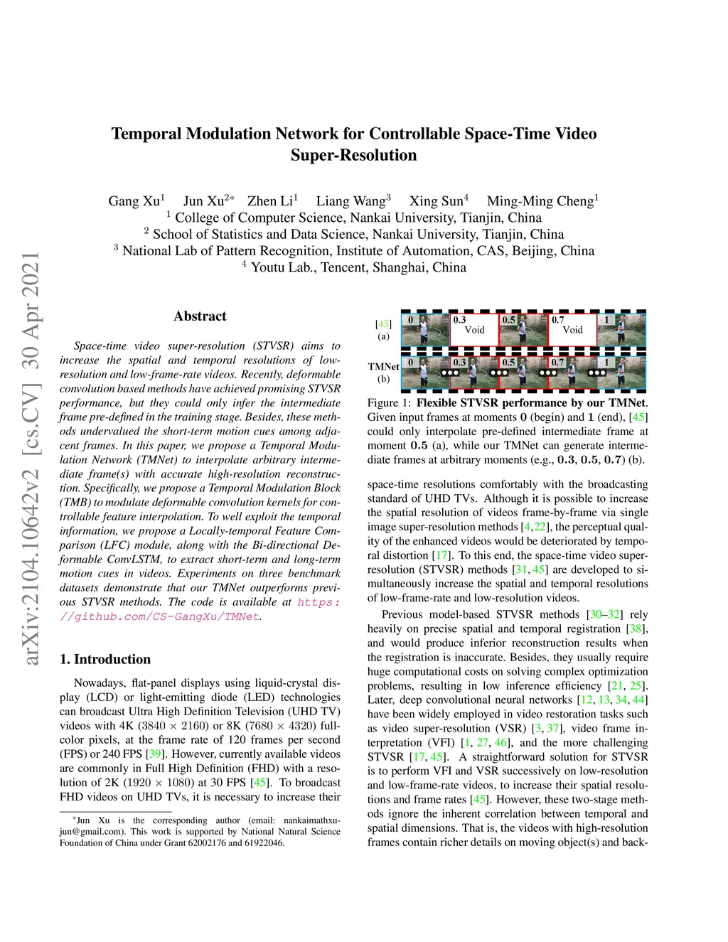Space-time video super-resolution (STVSR) aims to increase the spatial and temporal resolutions of low-resolution and low-frame-rate videos. Recently, deformable convolution based methods have achieved promising STVSR performance, but they could only infer the intermediate frame pre-defined in the training stage. Besides, these methods undervalued the short-term motion cues among adjacent frames. In this paper, we propose a Temporal Modulation Network (TMNet) to interpolate arbitrary intermediate frame(s) with accurate high-resolution reconstruction. Specifically, we propose a Temporal Modulation Block (TMB) to modulate deformable convolution kernels for controllable feature interpolation. To well exploit the temporal information, we propose a Locally-temporal Feature Comparison (LFC) module, along with the Bi-directional Deformable ConvLSTM, to extract short-term and long-term motion cues in videos. Experiments on three benchmark datasets demonstrate that our TMNet outperforms previous STVSR methods. The code is available at https://github.com/CS-GangXu/TMNet.