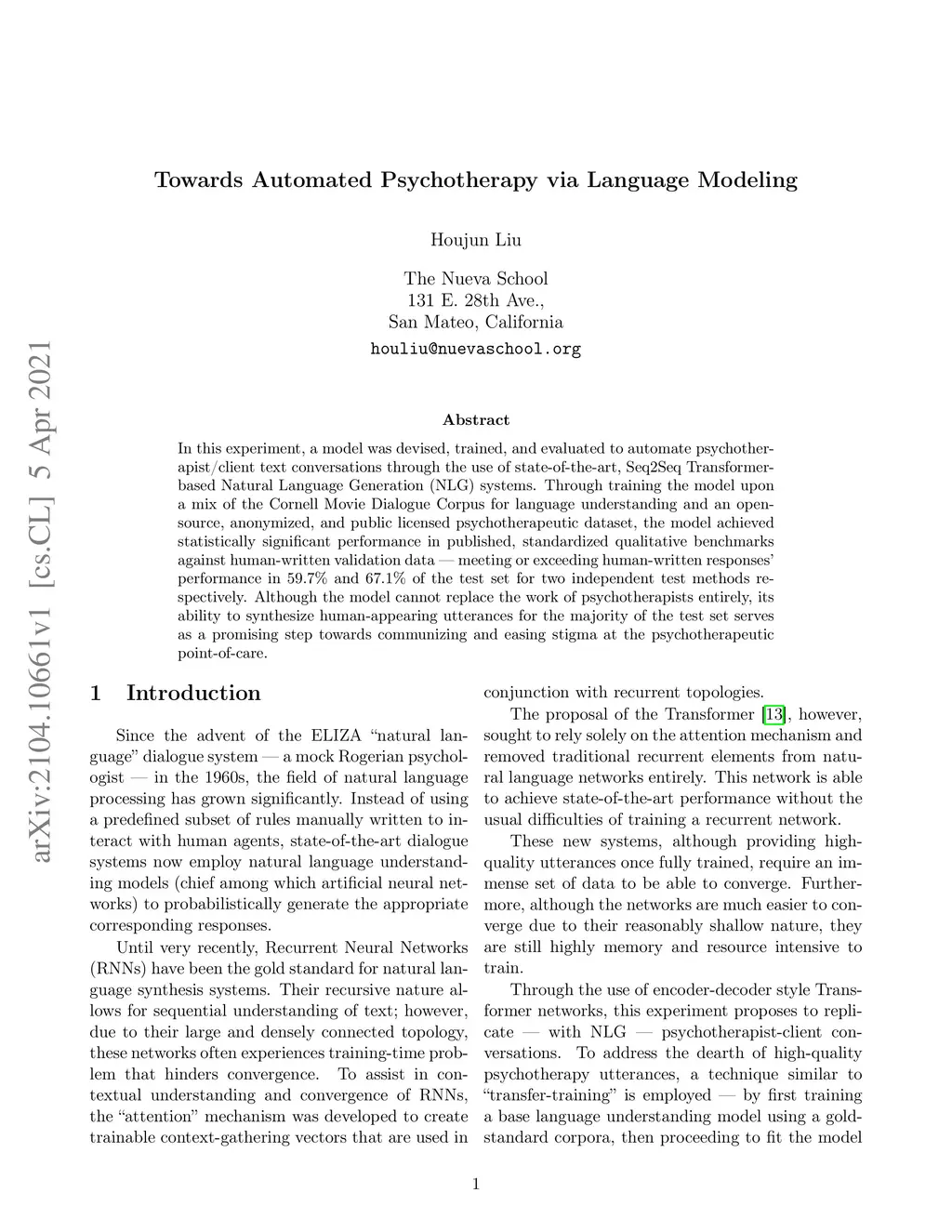 In this experiment, a model was devised, trained, and evaluated to automate psychotherapist/client text conversations through the use of state-of-the-art, Seq2Seq Transformer-based Natural Language Generation (NLG) systems. Through training the model upon a mix of the Cornell Movie Dialogue Corpus for language understanding and an open-source, anonymized, and public licensed psychotherapeutic dataset, the model achieved statistically significant performance in published, standardized qualitative benchmarks against human-written validation data - meeting or exceeding human-written responses' performance in 59.7% and 67.1% of the test set for two independent test methods respectively. Although the model cannot replace the work of psychotherapists entirely, its ability to synthesize human-appearing utterances for the majority of the test set serves as a promising step towards communizing and easing stigma at the psychotherapeutic point-of-care.