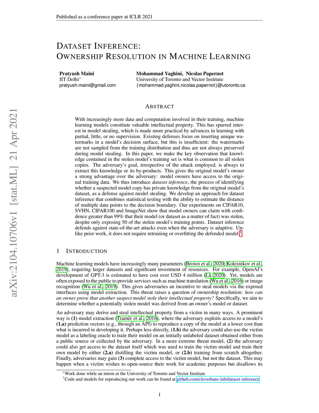 With increasingly more data and computation involved in their training, machine learning models constitute valuable intellectual property. This has spurred interest in model stealing, which is made more practical by advances in learning with partial, little, or no supervision. Existing defenses focus on inserting unique watermarks in a model's decision surface, but this is insufficient: the watermarks are not sampled from the training distribution and thus are not always preserved during model stealing. In this paper, we make the key observation that knowledge contained in the stolen model's training set is what is common to all stolen copies. The adversary's goal, irrespective of the attack employed, is always to extract this knowledge or its by-products. This gives the original model's owner a strong advantage over the adversary: model owners have access to the original training data. We thus introduce , the process of identifying whether a suspected model copy has private knowledge from the original model's dataset, as a defense against model stealing. We develop an approach for dataset inference that combines statistical testing with the ability to estimate the distance of multiple data points to the decision boundary. Our experiments on CIFAR10, SVHN, CIFAR100 and ImageNet show that model owners can claim with confidence greater than 99% that their model (or dataset as a matter of fact) was stolen, despite only exposing 50 of the stolen model's training points. Dataset inference defends against state-of-the-art attacks even when the adversary is adaptive. Unlike prior work, it does not require retraining or overfitting the defended model.