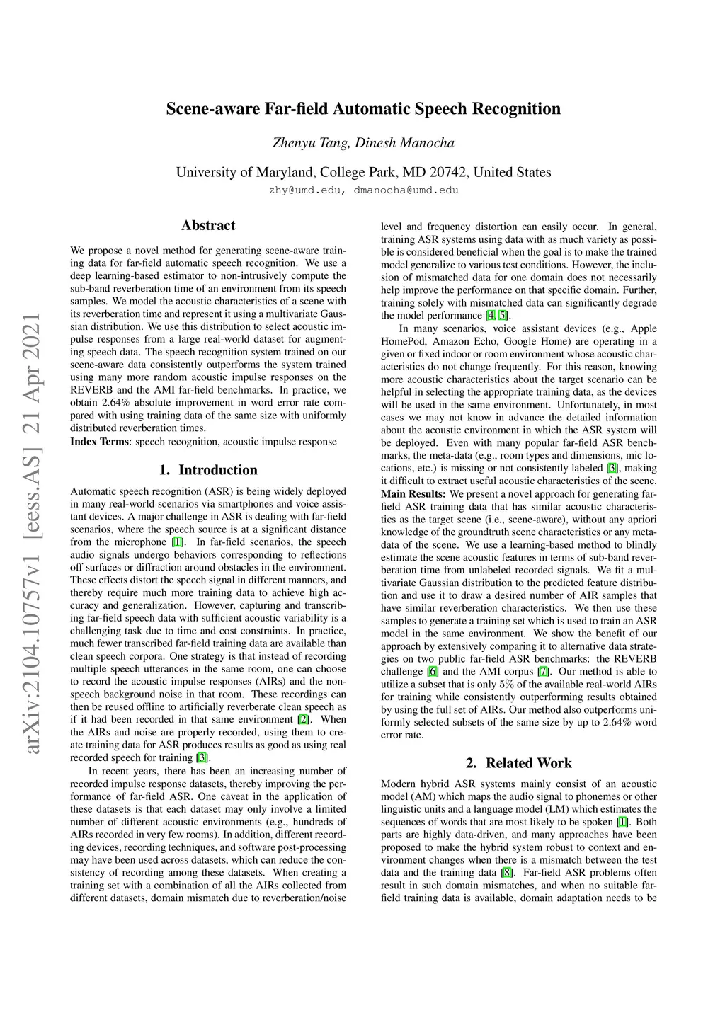 We propose a novel method for generating scene-aware training data for far-field automatic speech recognition. We use a deep learning-based estimator to non-intrusively compute the sub-band reverberation time of an environment from its speech samples. We model the acoustic characteristics of a scene with its reverberation time and represent it using a multivariate Gaussian distribution. We use this distribution to select acoustic impulse responses from a large real-world dataset for augmenting speech data. The speech recognition system trained on our scene-aware data consistently outperforms the system trained using many more random acoustic impulse responses on the REVERB and the AMI far-field benchmarks. In practice, we obtain 2.64% absolute improvement in word error rate compared with using training data of the same size with uniformly distributed reverberation times.