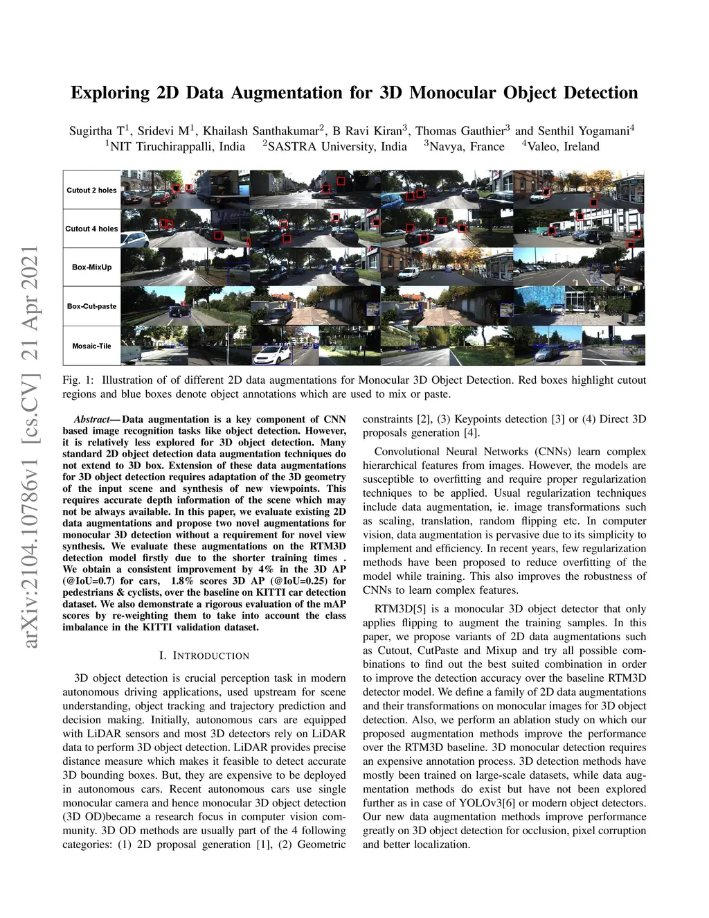 Data augmentation is a key component of CNN based image recognition tasks like object detection. However, it is relatively less explored for 3D object detection. Many standard 2D object detection data augmentation techniques do not extend to 3D box. Extension of these data augmentations for 3D object detection requires adaptation of the 3D geometry of the input scene and synthesis of new viewpoints. This requires accurate depth information of the scene which may not be always available. In this paper, we evaluate existing 2D data augmentations and propose two novel augmentations for monocular 3D detection without a requirement for novel view synthesis. We evaluate these augmentations on the RTM3D detection model firstly due to the shorter training times . We obtain a consistent improvement by 4% in the 3D AP (@IoU=0.7) for cars, ~1.8% scores 3D AP (@IoU=0.25) for pedestrians & cyclists, over the baseline on KITTI car detection dataset. We also demonstrate a rigorous evaluation of the mAP scores by re-weighting them to take into account the class imbalance in the KITTI validation dataset.