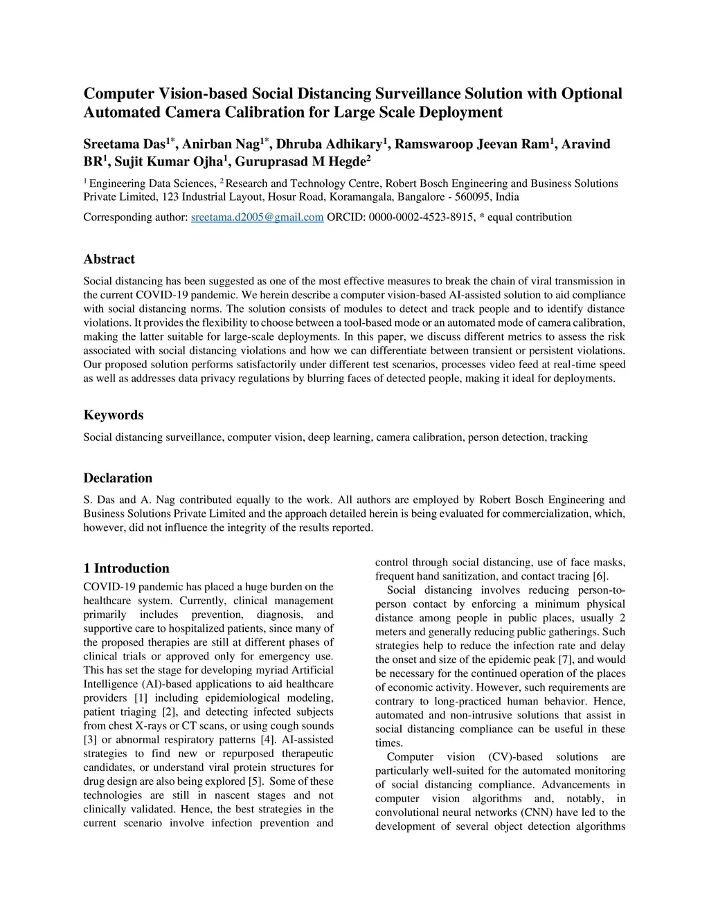 Social distancing has been suggested as one of the most effective measures to break the chain of viral transmission in the current COVID-19 pandemic. We herein describe a computer vision-based AI-assisted solution to aid compliance with social distancing norms. The solution consists of modules to detect and track people and to identify distance violations. It provides the flexibility to choose between a tool-based mode or an automated mode of camera calibration, making the latter suitable for large-scale deployments. In this paper, we discuss different metrics to assess the risk associated with social distancing violations and how we can differentiate between transient or persistent violations. Our proposed solution performs satisfactorily under different test scenarios, processes video feed at real-time speed as well as addresses data privacy regulations by blurring faces of detected people, making it ideal for deployments.