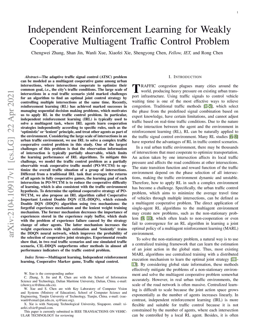The adaptive traffic signal control (ATSC) problem can be modeled as a multiagent cooperative game among urban intersections, where intersections cooperate to optimize their common goal. Recently, reinforcement learning (RL) has achieved marked successes in managing sequential decision making problems, which motivates us to apply RL in the ASTC problem. Here we use independent reinforcement learning (IRL) to solve a complex traffic cooperative control problem in this study. One of the largest challenges of this problem is that the observation information of intersection is typically partially observable, which limits the learning performance of IRL algorithms. To this, we model the traffic control problem as a partially observable weak cooperative traffic model (PO-WCTM) to optimize the overall traffic situation of a group of intersections. Different from a traditional IRL task that averages the returns of all agents in fully cooperative games, the learning goal of each intersection in PO-WCTM is to reduce the cooperative difficulty of learning, which is also consistent with the traffic environment hypothesis. We also propose an IRL algorithm called Cooperative Important Lenient Double DQN (CIL-DDQN), which extends Double DQN (DDQN) algorithm using two mechanisms: the forgetful experience mechanism and the lenient weight training mechanism. The former mechanism decreases the importance of experiences stored in the experience reply buffer, which deals with the problem of experience failure caused by the strategy change of other agents. The latter mechanism increases the weight experiences with high estimation and `leniently' trains the DDQN neural network, which improves the probability of the selection of cooperative joint strategies. Experimental results show that CIL-DDQN outperforms other methods in almost all performance indicators of the traffic control problem.