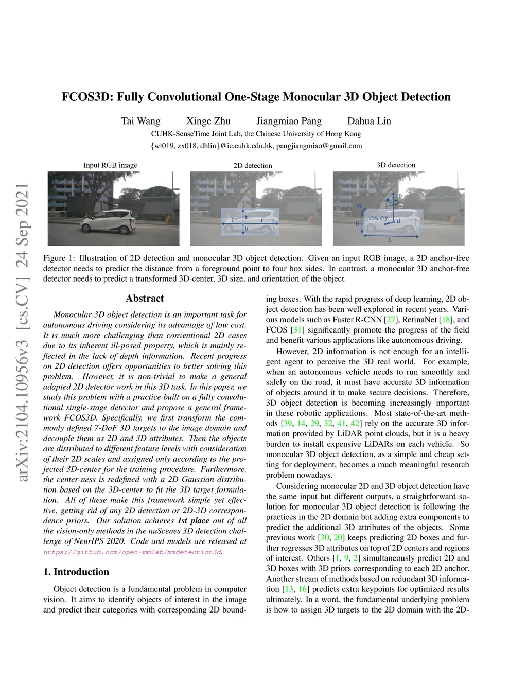 Monocular 3D object detection is an important task for autonomous driving considering its advantage of low cost. It is much more challenging compared to conventional 2D case due to its inherent ill-posed property, which is mainly reflected on the lack of depth information. Recent progress on 2D detection offers opportunities to better solving this problem. However, it is non-trivial to make a general adapted 2D detector work in this 3D task. In this technical report, we study this problem with a practice built on fully convolutional single-stage detector and propose a general framework FCOS3D. Specifically, we first transform the commonly defined 7-DoF 3D targets to image domain and decouple it as 2D and 3D attributes. Then the objects are distributed to different feature levels with the consideration of their 2D scales and assigned only according to the projected 3D-center for training procedure. Furthermore, the center-ness is redefined with a 2D Guassian distribution based on the 3D-center to fit the 3D target formulation. All of these make this framework simple yet effective, getting rid of any 2D detection or 2D-3D correspondence priors. Our solution achieves 1st place out of all the vision-only methods in the nuScenes 3D detection challenge of NeurIPS 2020. Code and models are released at https://github.com/open-mmlab/mmdetection3d.