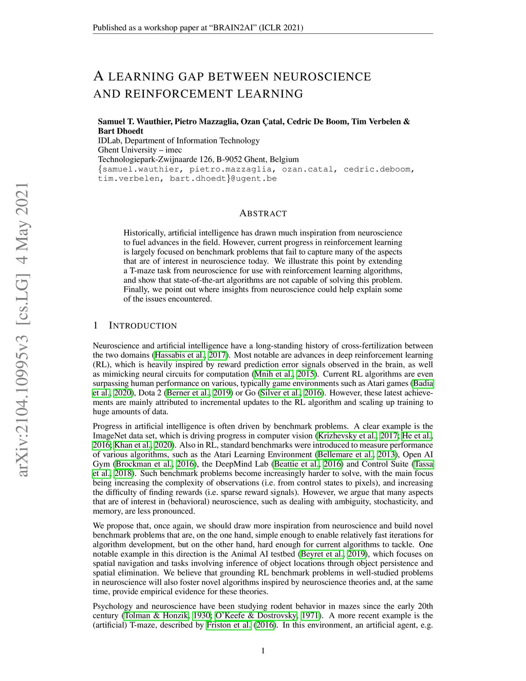Historically, artificial intelligence has drawn much inspiration from neuroscience to fuel advances in the field. However, current progress in reinforcement learning is largely focused on benchmark problems that fail to capture many of the aspects that are of interest in neuroscience today. We illustrate this point by extending a T-maze task from neuroscience for use with reinforcement learning algorithms, and show that state-of-the-art algorithms are not capable of solving this problem. Finally, we point out where insights from neuroscience could help explain some of the issues encountered.