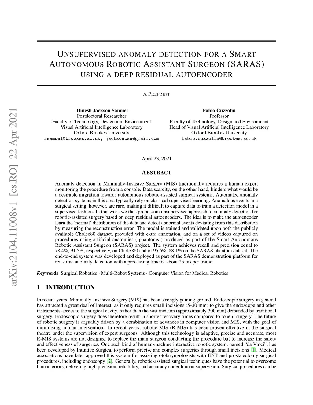 Anomaly detection in Minimally-Invasive Surgery (MIS) traditionally requires a human expert monitoring the procedure from a console. Data scarcity, on the other hand, hinders what would be a desirable migration towards autonomous robotic-assisted surgical systems. Automated anomaly detection systems in this area typically rely on classical supervised learning. Anomalous events in a surgical setting, however, are rare, making it difficult to capture data to train a detection model in a supervised fashion. In this work we thus propose an unsupervised approach to anomaly detection for robotic-assisted surgery based on deep residual autoencoders. The idea is to make the autoencoder learn the ñormal' distribution of the data and detect abnormal events deviating from this distribution by measuring the reconstruction error. The model is trained and validated upon both the publicly available Cholec80 dataset, provided with extra annotation, and on a set of videos captured on procedures using artificial anatomies ('phantoms') produced as part of the Smart Autonomous Robotic Assistant Surgeon (SARAS) project. The system achieves recall and precision equal to 78.4%, 91.5%, respectively, on Cholec80 and of 95.6%, 88.1% on the SARAS phantom dataset. The end-to-end system was developed and deployed as part of the SARAS demonstration platform for real-time anomaly detection with a processing time of about 25 ms per frame.