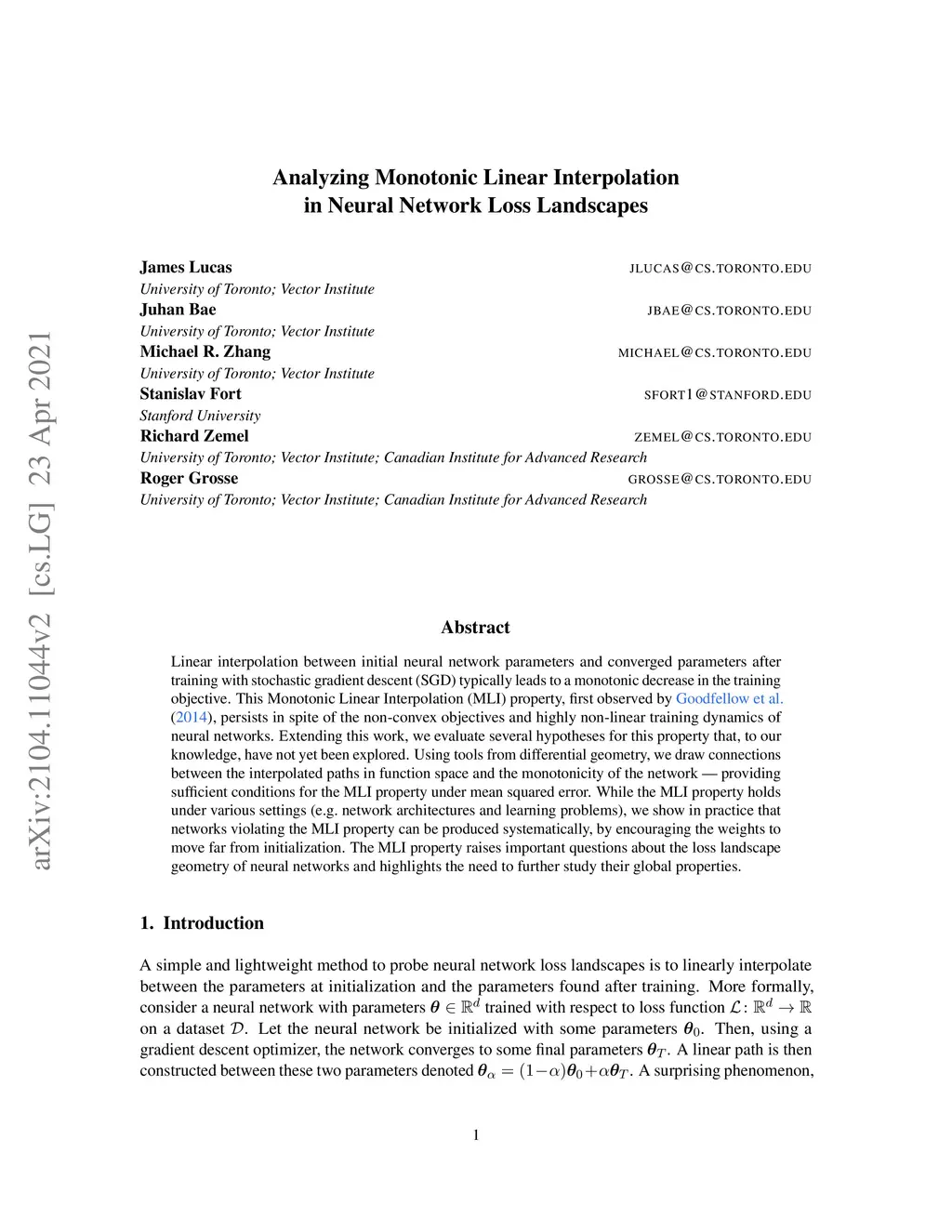 Linear interpolation between initial neural network parameters and converged parameters after training with stochastic gradient descent (SGD) typically leads to a monotonic decrease in the training objective. This Monotonic Linear Interpolation (MLI) property, first observed by Goodfellow et al. (2014) persists in spite of the non-convex objectives and highly non-linear training dynamics of neural networks. Extending this work, we evaluate several hypotheses for this property that, to our knowledge, have not yet been explored. Using tools from differential geometry, we draw connections between the interpolated paths in function space and the monotonicity of the network - providing sufficient conditions for the MLI property under mean squared error. While the MLI property holds under various settings (e.g. network architectures and learning problems), we show in practice that networks violating the MLI property can be produced systematically, by encouraging the weights to move far from initialization. The MLI property raises important questions about the loss landscape geometry of neural networks and highlights the need to further study their global properties.