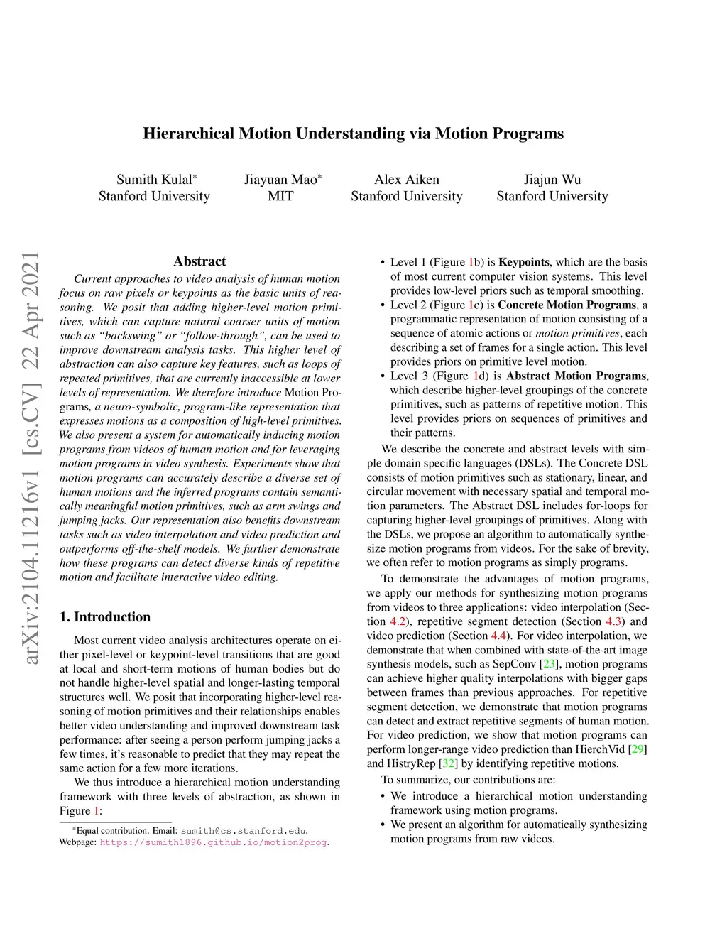 Current approaches to video analysis of human motion focus on raw pixels or keypoints as the basic units of reasoning. We posit that adding higher-level motion primitives, which can capture natural coarser units of motion such as backswing or follow-through, can be used to improve downstream analysis tasks. This higher level of abstraction can also capture key features, such as loops of repeated primitives, that are currently inaccessible at lower levels of representation. We therefore introduce Motion Programs, a neuro-symbolic, program-like representation that expresses motions as a composition of high-level primitives. We also present a system for automatically inducing motion programs from videos of human motion and for leveraging motion programs in video synthesis. Experiments show that motion programs can accurately describe a diverse set of human motions and the inferred programs contain semantically meaningful motion primitives, such as arm swings and jumping jacks. Our representation also benefits downstream tasks such as video interpolation and video prediction and outperforms off-the-shelf models. We further demonstrate how these programs can detect diverse kinds of repetitive motion and facilitate interactive video editing.