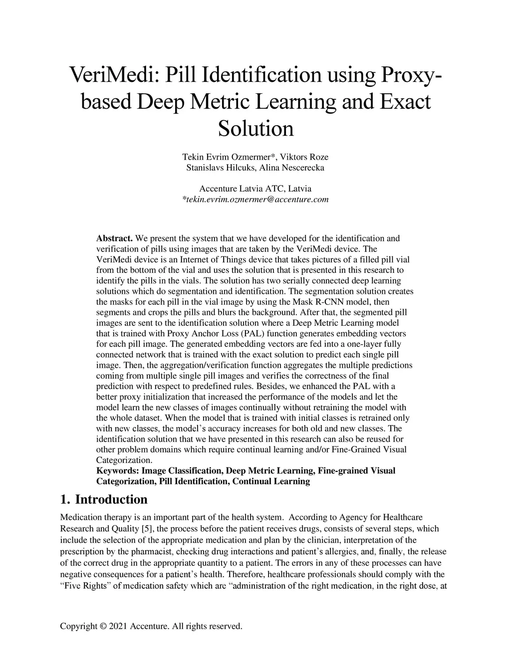 We present the system that we have developed for the identification and verification of pills using images that are taken by the VeriMedi device. The VeriMedi device is an Internet of Things device that takes pictures of a filled pill vial from the bottom of the vial and uses the solution that is presented in this research to identify the pills in the vials. The solution has two serially connected deep learning solutions which do segmentation and identification. The segmentation solution creates the masks for each pill in the vial image by using the Mask R-CNN model, then segments and crops the pills and blurs the background. After that, the segmented pill images are sent to the identification solution where a Deep Metric Learning model that is trained with Proxy Anchor Loss (PAL) function generates embedding vectors for each pill image. The generated embedding vectors are fed into a one-layer fully connected network that is trained with the exact solution to predict each single pill image. Then, the aggregation/verification function aggregates the multiple predictions coming from multiple single pill images and verifies the correctness of the final prediction with respect to predefined rules. Besides, we enhanced the PAL with a better proxy initialization that increased the performance of the models and let the model learn the new classes of images continually without retraining the model with the whole dataset. When the model that is trained with initial classes is retrained only with new classes, the accuracy of the model increases for both old and new classes. The identification solution that we have presented in this research can also be reused for other problem domains which require continual learning and/or Fine-Grained Visual Categorization.