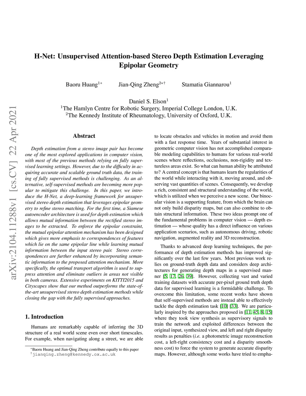 Depth estimation from a stereo image pair has become one of the most explored applications in computer vision, with most of the previous methods relying on fully supervised learning settings. However, due to the difficulty in acquiring accurate and scalable ground truth data, the training of fully supervised methods is challenging. As an alternative, self-supervised methods are becoming more popular to mitigate this challenge. In this paper, we introduce the H-Net, a deep-learning framework for unsupervised stereo depth estimation that leverages epipolar geometry to refine stereo matching. For the first time, a Siamese autoencoder architecture is used for depth estimation which allows mutual information between the rectified stereo images to be extracted. To enforce the epipolar constraint, the mutual epipolar attention mechanism has been designed which gives more emphasis to correspondences of features which lie on the same epipolar line while learning mutual information between the input stereo pair. Stereo correspondences are further enhanced by incorporating semantic information to the proposed attention mechanism. More specifically, the optimal transport algorithm is used to suppress attention and eliminate outliers in areas not visible in both cameras. Extensive experiments on KITTI2015 and Cityscapes show that our method outperforms the state-ofthe-art unsupervised stereo depth estimation methods while closing the gap with the fully supervised approaches.