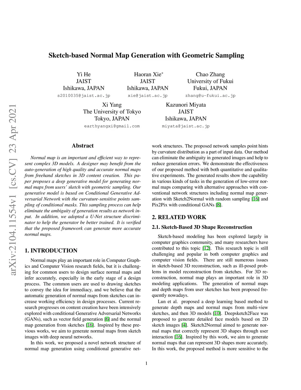 Normal map is an important and efficient way to represent complex 3D models. A designer may benefit from the auto-generation of high quality and accurate normal maps from freehand sketches in 3D content creation. This paper proposes a deep generative model for generating normal maps from users sketch with geometric sampling. Our generative model is based on Conditional Generative Adversarial Network with the curvature-sensitive points sampling of conditional masks. This sampling process can help eliminate the ambiguity of generation results as network input. In addition, we adopted a U-Net structure discriminator to help the generator be better trained. It is verified that the proposed framework can generate more accurate normal maps.