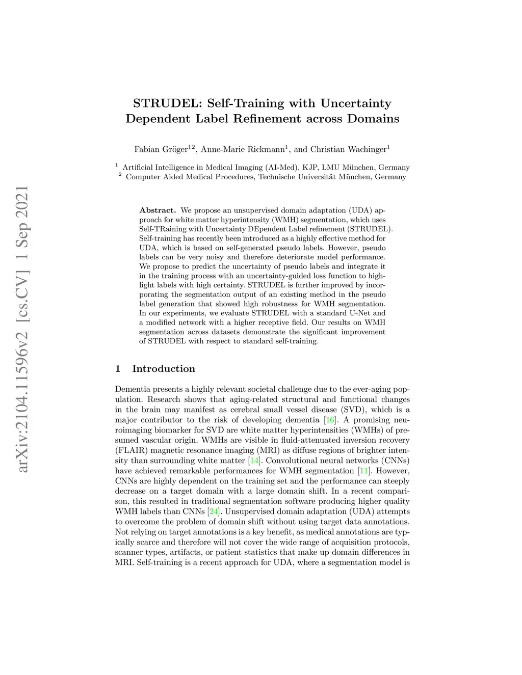 We propose an unsupervised domain adaptation (UDA) approach for white matter hyperintensity (WMH) segmentation, which uses Self-Training with Uncertainty DEpendent Label refinement (STRUDEL). Self-training has recently been introduced as a highly effective method for UDA, which is based on self-generated pseudo labels. However, pseudo labels can be very noisy and therefore deteriorate model performance. We propose to predict the uncertainty of pseudo labels and integrate it in the training process with an uncertainty-guided loss function to highlight labels with high certainty. STRUDEL is further improved by incorporating the segmentation output of an existing method in the pseudo label generation that showed high robustness for WMH segmentation. In our experiments, we evaluate STRUDEL with a standard U-Net and a modified network with a higher receptive field. Our results on WMH segmentation across datasets demonstrate the significant improvement of STRUDEL with respect to standard self-training.