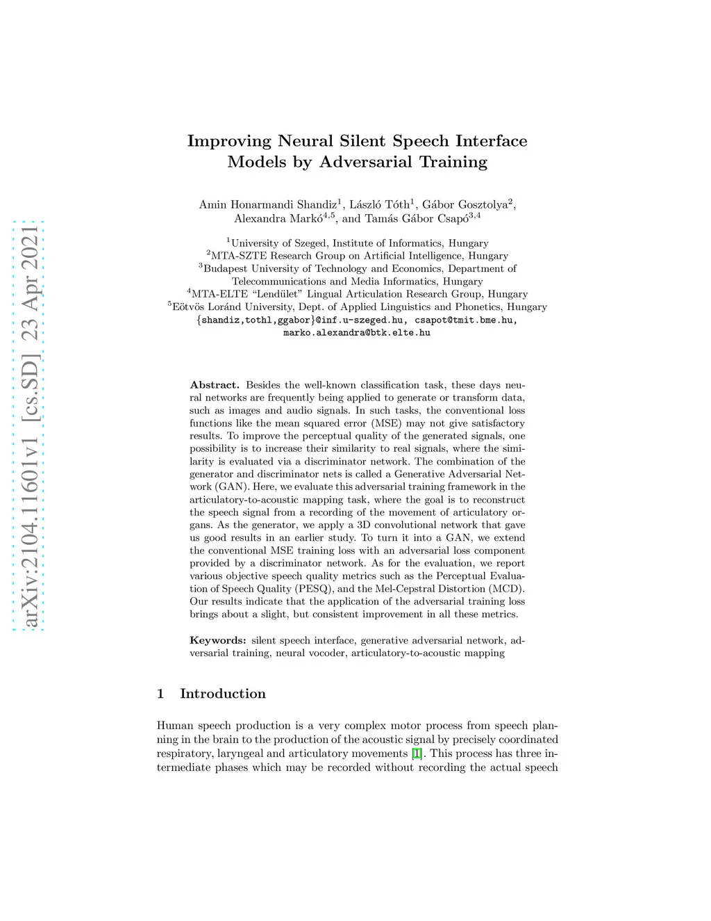Improving Neural Silent Speech Interface Models by Adversarial Training