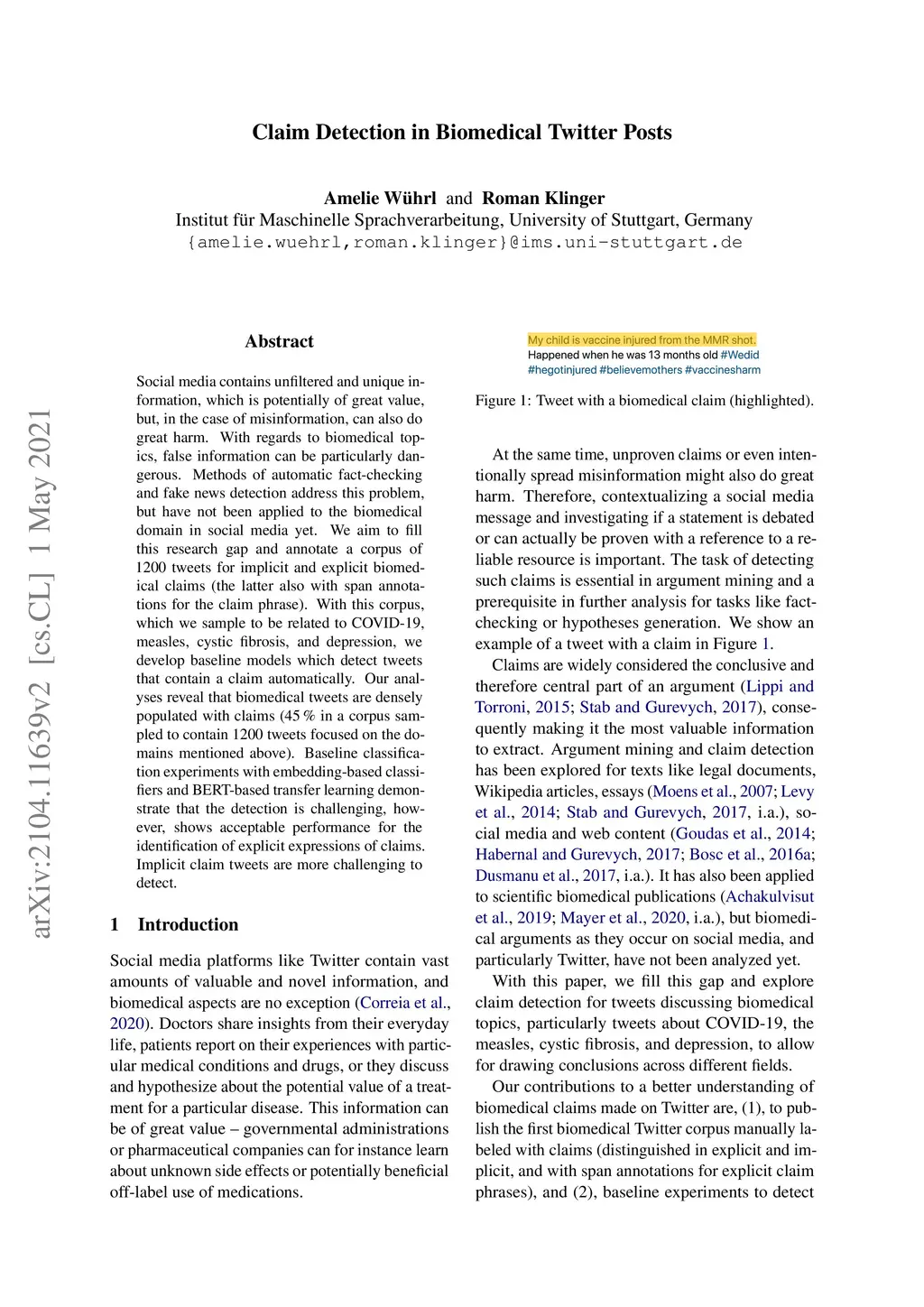 Social media contains unfiltered and unique information, which is potentially of great value, but, in the case of misinformation, can also do great harm. With regards to biomedical topics, false information can be particularly dangerous. Methods of automatic fact-checking and fake news detection address this problem, but have not been applied to the biomedical domain in social media yet. We aim to fill this research gap and annotate a corpus of 1200 tweets for implicit and explicit biomedical claims (the latter also with span annotations for the claim phrase). With this corpus, which we sample to be related to COVID-19, measles, cystic fibrosis, and depression, we develop baseline models which detect tweets that contain a claim automatically. Our analyses reveal that biomedical tweets are densely populated with claims (45 % in a corpus sampled to contain 1200 tweets focused on the domains mentioned above). Baseline classification experiments with embedding-based classifiers and BERT-based transfer learning demonstrate that the detection is challenging, however, shows acceptable performance for the identification of explicit expressions of claims. Implicit claim tweets are more challenging to detect.