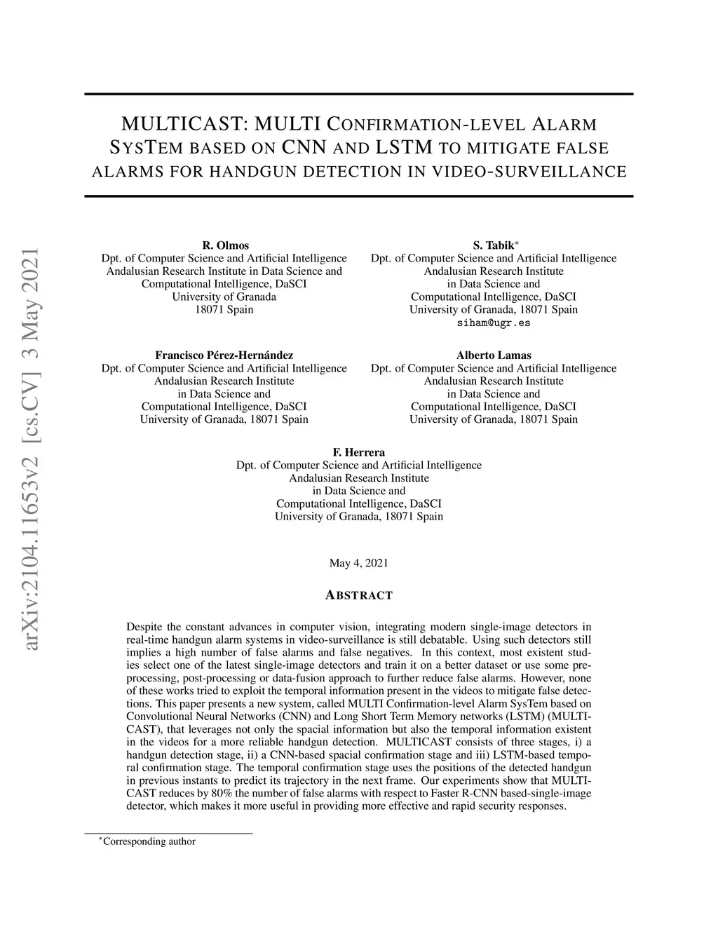 Despite the constant advances in computer vision, integrating modern single-image detectors in real-time handgun alarm systems in video-surveillance is still debatable. Using such detectors still implies a high number of false alarms and false negatives. In this context, most existent studies select one of the latest single-image detectors and train it on a better dataset or use some pre-processing, post-processing or data-fusion approach to further reduce false alarms. However, none of these works tried to exploit the temporal information present in the videos to mitigate false detections. This paper presents a new system, called MULTI Confirmation-level Alarm SysTem based on Convolutional Neural Networks (CNN) and Long Short Term Memory networks (LSTM) (MULTICAST), that leverages not only the spacial information but also the temporal information existent in the videos for a more reliable handgun detection. MULTICAST consists of three stages, i) a handgun detection stage, ii) a CNN-based spacial confirmation stage and iii) LSTM-based temporal confirmation stage. The temporal confirmation stage uses the positions of the detected handgun in previous instants to predict its trajectory in the next frame. Our experiments show that MULTICAST reduces by 80% the number of false alarms with respect to Faster R-CNN based-single-image detector, which makes it more useful in providing more effective and rapid security responses.