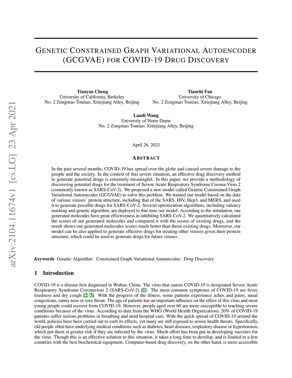 In the past several months, COVID-19 has spread over the globe and caused severe damage to the people and the society. In the context of this severe situation, an effective drug discovery method to generate potential drugs is extremely meaningful. In this paper, we provide a methodology of discovering potential drugs for the treatment of Severe Acute Respiratory Syndrome Corona-Virus 2 (commonly known as SARS-CoV-2). We proposed a new model called Genetic Constrained Graph Variational Autoencoder (GCGVAE) to solve this problem. We trained our model based on the data of various viruses' protein structure, including that of the SARS, HIV, Hep3, and MERS, and used it to generate possible drugs for SARS-CoV-2. Several optimization algorithms, including valency masking and genetic algorithm, are deployed to fine tune our model. According to the simulation, our generated molecules have great effectiveness in inhibiting SARS-CoV-2. We quantitatively calculated the scores of our generated molecules and compared it with the scores of existing drugs, and the result shows our generated molecules scores much better than those existing drugs. Moreover, our model can be also applied to generate effective drugs for treating other viruses given their protein structure, which could be used to generate drugs for future viruses.