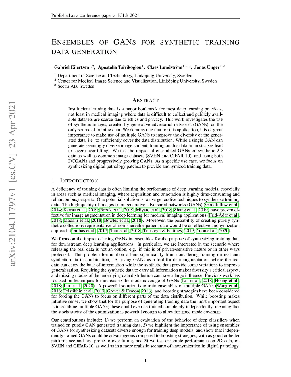 Insufficient training data is a major bottleneck for most deep learning practices, not least in medical imaging where data is difficult to collect and publicly available datasets are scarce due to ethics and privacy. This work investigates the use of synthetic images, created by generative adversarial networks (GANs), as the only source of training data. We demonstrate that for this application, it is of great importance to make use of multiple GANs to improve the diversity of the generated data, i.e. to sufficiently cover the data distribution. While a single GAN can generate seemingly diverse image content, training on this data in most cases lead to severe over-fitting. We test the impact of ensembled GANs on synthetic 2D data as well as common image datasets (SVHN and CIFAR-10), and using both DCGANs and progressively growing GANs. As a specific use case, we focus on synthesizing digital pathology patches to provide anonymized training data.