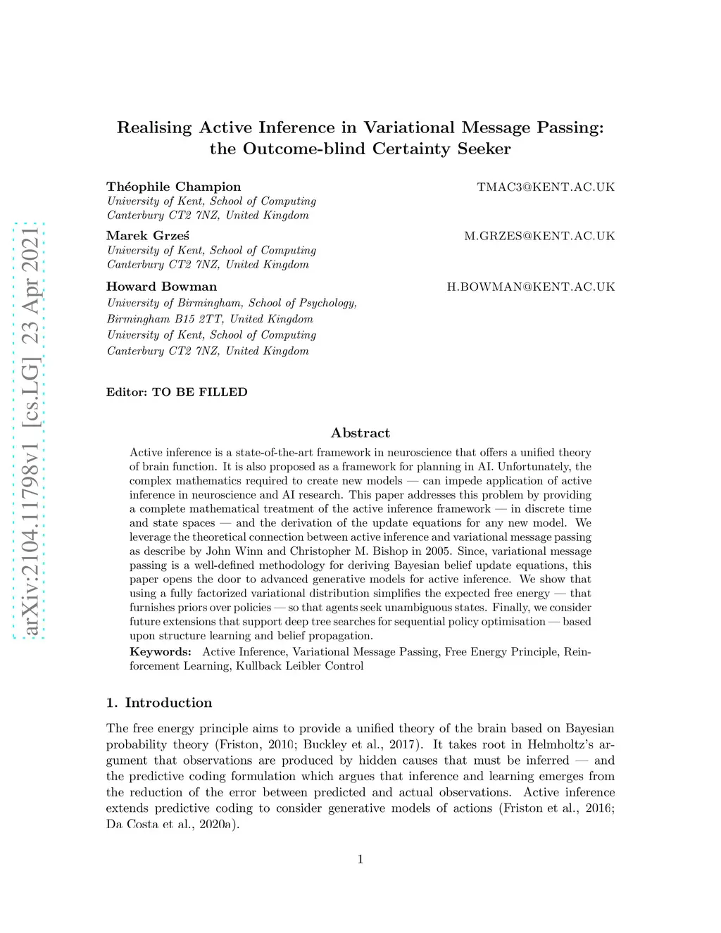 Realising Active Inference in Variational Message Passing: the