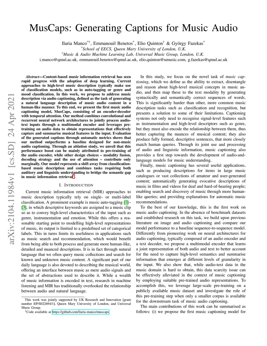 Content-based music information retrieval has seen rapid progress with the adoption of deep learning. Current approaches to high-level music description typically make use of classification models, such as in auto-tagging or genre and mood classification. In this work, we propose to address music description via audio captioning, defined as the task of generating a natural language description of music audio content in a human-like manner. To this end, we present the first music audio captioning model, MusCaps, consisting of an encoder-decoder with temporal attention. Our method combines convolutional and recurrent neural network architectures to jointly process audio-text inputs through a multimodal encoder and leverages pre-training on audio data to obtain representations that effectively capture and summarise musical features in the input. Evaluation of the generated captions through automatic metrics shows that our method outperforms a baseline designed for non-music audio captioning. Through an ablation study, we unveil that this performance boost can be mainly attributed to pre-training of the audio encoder, while other design choices - modality fusion, decoding strategy and the use of attention - contribute only marginally. Our model represents a shift away from classification-based music description and combines tasks requiring both auditory and linguistic understanding to bridge the semantic gap in music information retrieval.