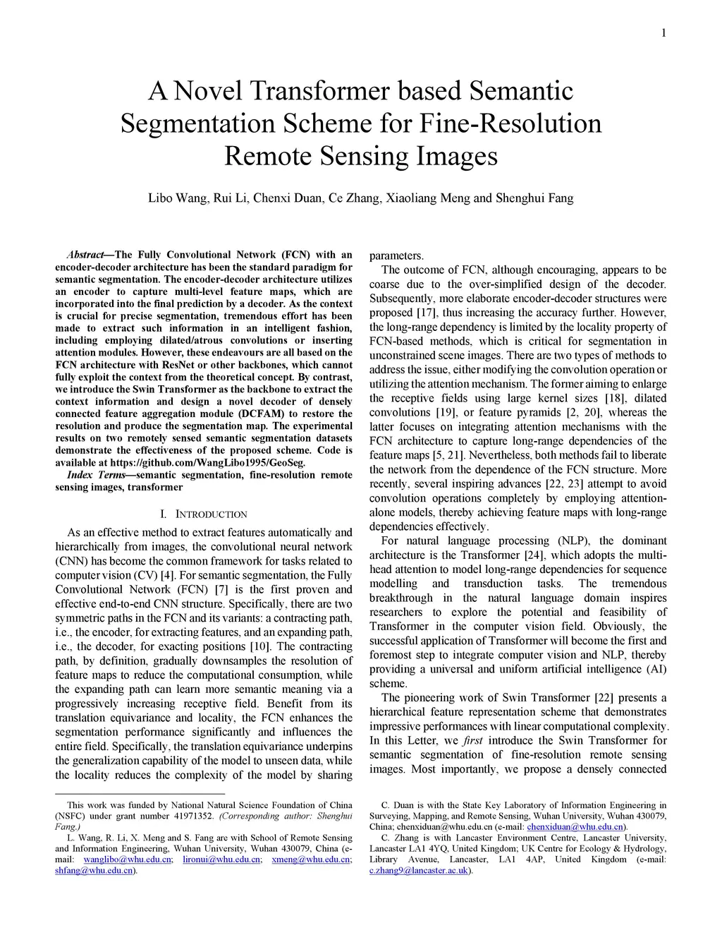 The fully convolutional network (FCN) with an encoder-decoder architecture has been the standard paradigm for semantic segmentation. The encoder-decoder architecture utilizes an encoder to capture multilevel feature maps, which are incorporated into the final prediction by a decoder. As the context is crucial for precise segmentation, tremendous effort has been made to extract such information in an intelligent fashion, including employing dilated/atrous convolutions or inserting attention modules. However, these endeavors are all based on the FCN architecture with ResNet or other backbones, which cannot fully exploit the context from the theoretical concept. By contrast, we introduce the Swin Transformer as the backbone to extract the context information and design a novel decoder of densely connected feature aggregation module (DCFAM) to restore the resolution and produce the segmentation map. The experimental results on two remotely sensed semantic segmentation datasets demonstrate the effectiveness of the proposed scheme.Code is available at https://github.com/WangLibo1995/GeoSeg