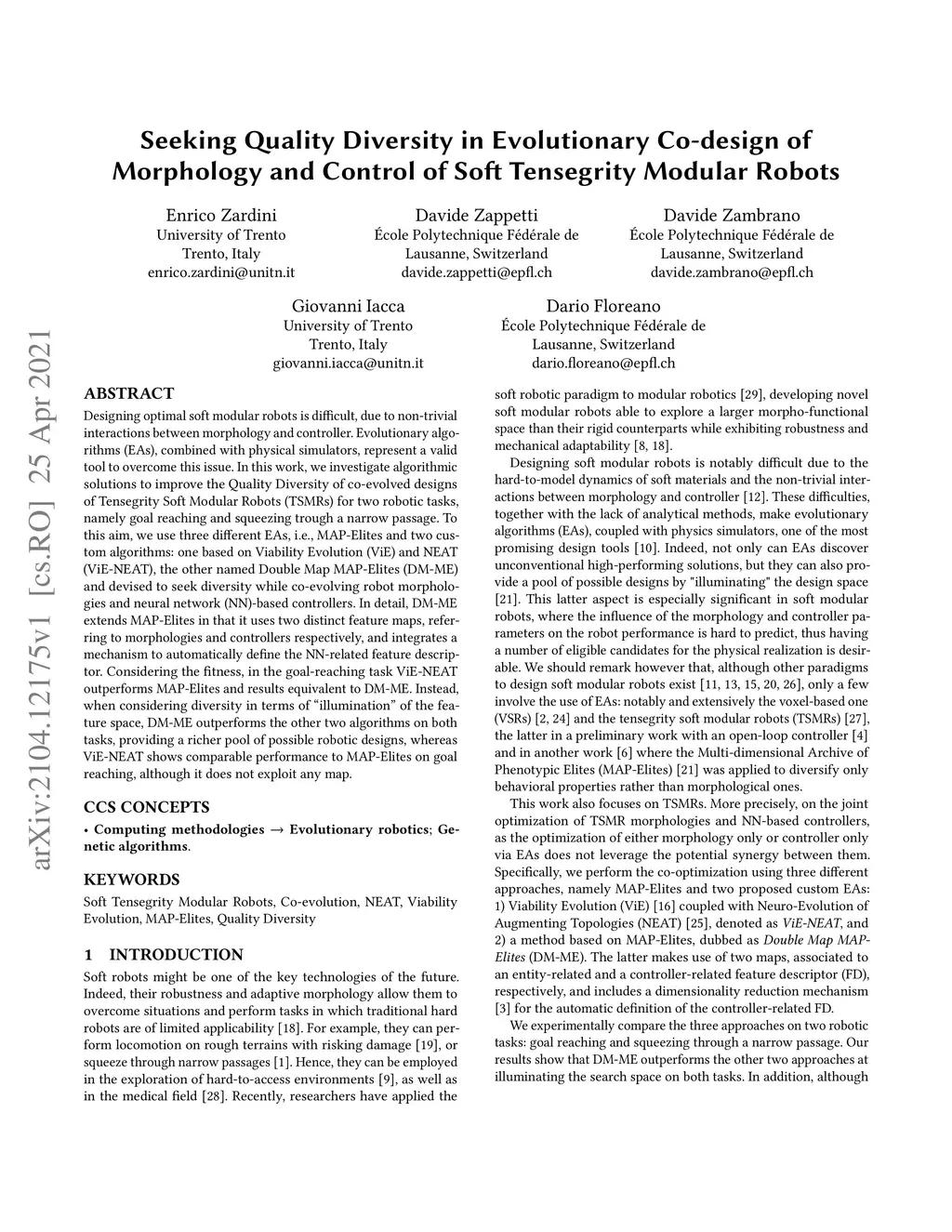 Designing optimal soft modular robots is difficult, due to non-trivial interactions between morphology and controller. Evolutionary algorithms (EAs), combined with physical simulators, represent a valid tool to overcome this issue. In this work, we investigate algorithmic solutions to improve the Quality Diversity of co-evolved designs of Tensegrity Soft Modular Robots (TSMRs) for two robotic tasks, namely goal reaching and squeezing trough a narrow passage. To this aim, we use three different EAs, i.e., MAP-Elites and two custom algorithms: one based on Viability Evolution (ViE) and NEAT (ViE-NEAT), the other named Double Map MAP-Elites (DM-ME) and devised to seek diversity while co-evolving robot morphologies and neural network (NN)-based controllers. In detail, DM-ME extends MAP-Elites in that it uses two distinct feature maps, referring to morphologies and controllers respectively, and integrates a mechanism to automatically define the NN-related feature descriptor. Considering the fitness, in the goal-reaching task ViE-NEAT outperforms MAP-Elites and results equivalent to DM-ME. Instead, when considering diversity in terms of "illumination" of the feature space, DM-ME outperforms the other two algorithms on both tasks, providing a richer pool of possible robotic designs, whereas ViE-NEAT shows comparable performance to MAP-Elites on goal reaching, although it does not exploit any map.