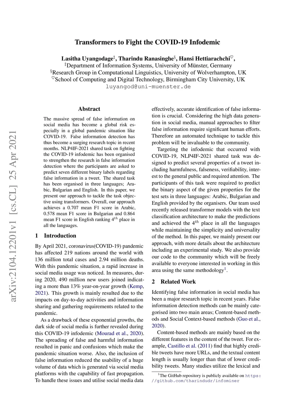 The massive spread of false information on social media has become a global risk especially in a global pandemic situation like COVID-19. False information detection has thus become a surging research topic in recent months. NLP4IF-2021 shared task on fighting the COVID-19 infodemic has been organised to strengthen the research in false information detection where the participants are asked to predict seven different binary labels regarding false information in a tweet. The shared task has been organised in three languages; Arabic, Bulgarian and English. In this paper, we present our approach to tackle the task objective using transformers. Overall, our approach achieves a 0.707 mean F1 score in Arabic, 0.578 mean F1 score in Bulgarian and 0.864 mean F1 score in English ranking 4th place in all the languages.