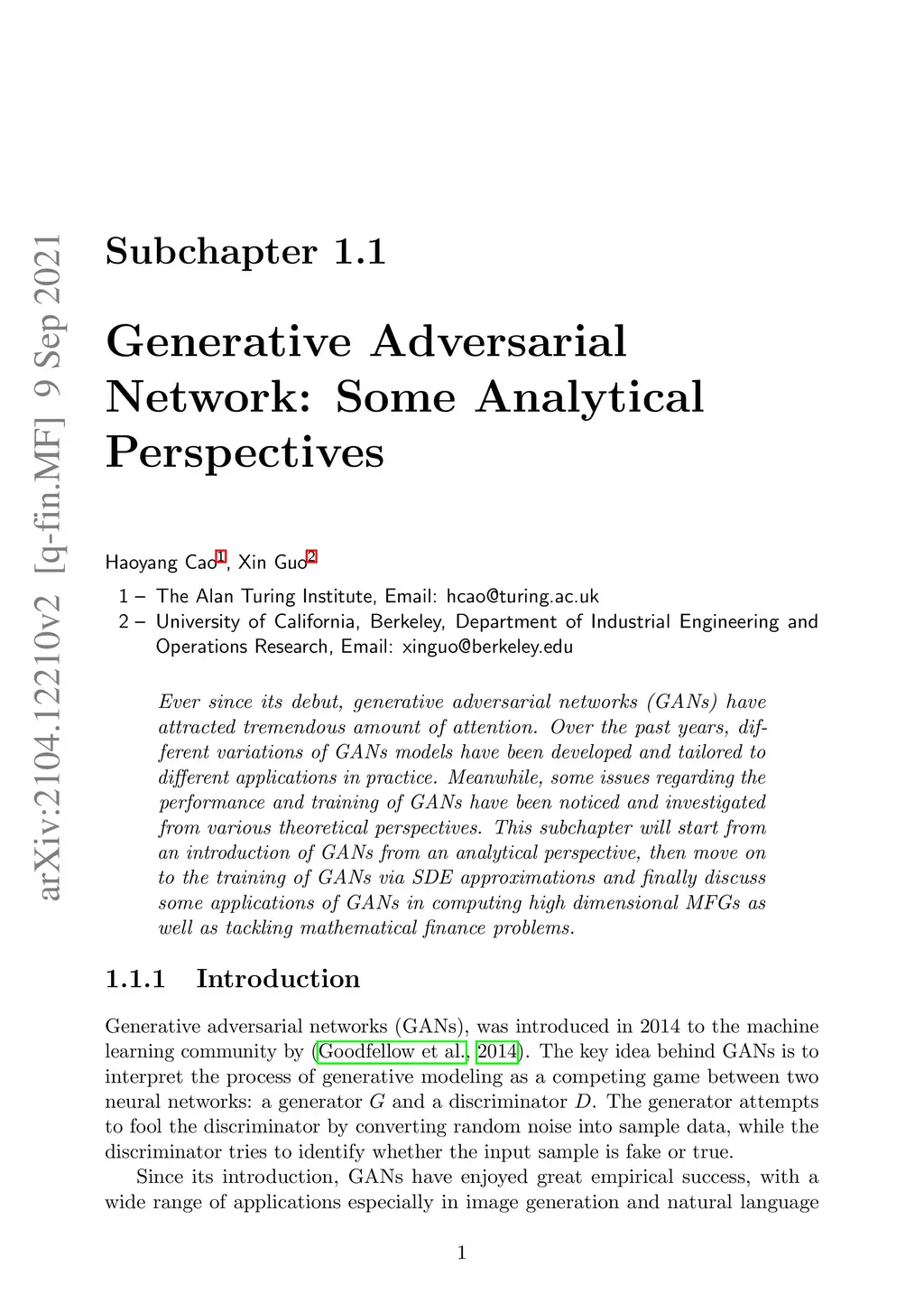 Ever since its debut, generative adversarial networks (GANs) have attracted tremendous amount of attention. Over the past years, different variations of GANs models have been developed and tailored to different applications in practice. Meanwhile, some issues regarding the performance and training of GANs have been noticed and investigated from various theoretical perspectives. This subchapter will start from an introduction of GANs from an analytical perspective, then move on to the training of GANs via SDE approximations and finally discuss some applications of GANs in computing high dimensional MFGs as well as tackling mathematical finance problems.