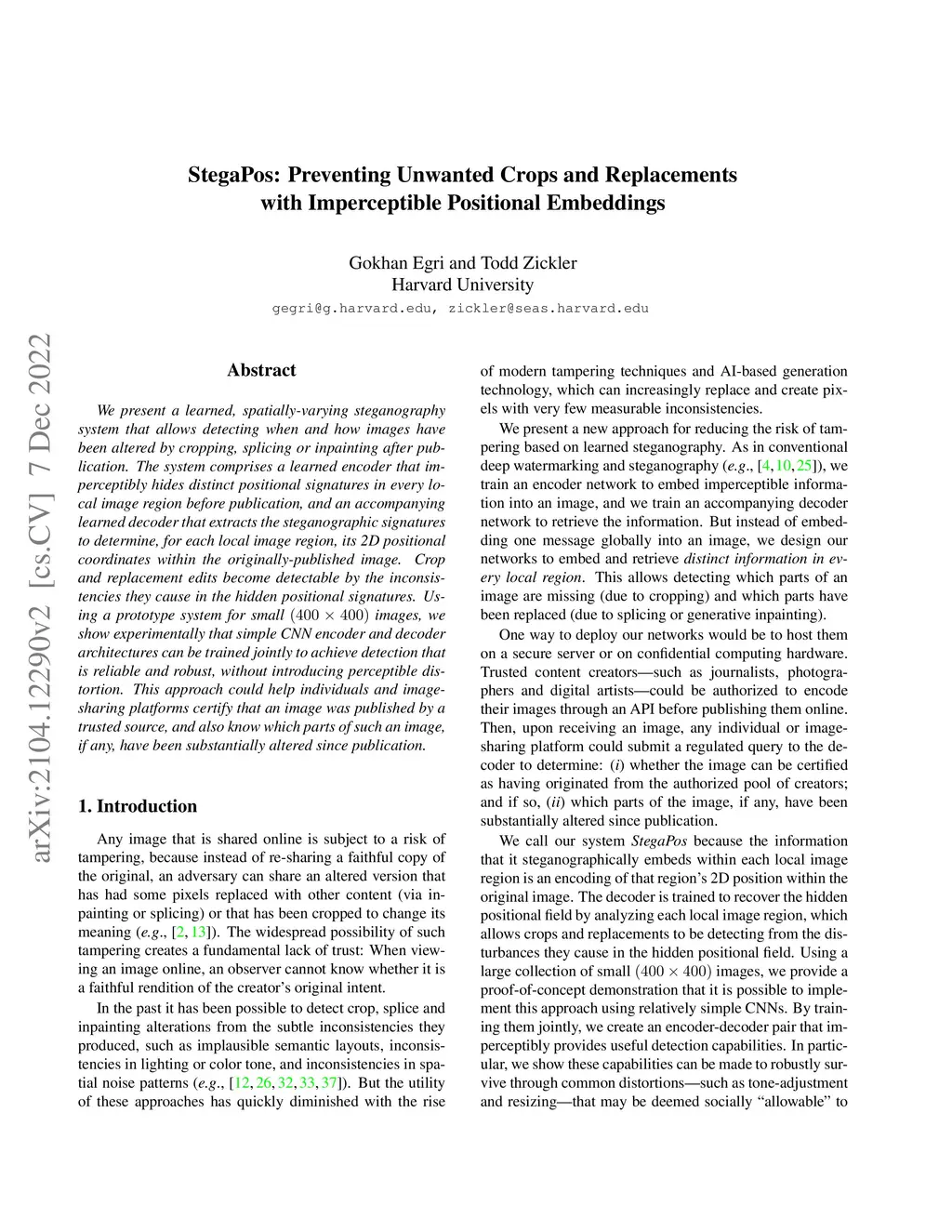 We present a learned, spatially-varying steganography system that allows detecting when and how images have been altered by cropping, splicing or inpainting after publication. The system comprises a learned encoder that imperceptibly hides distinct positional signatures in every local image region before publication, and an accompanying learned decoder that extracts the steganographic signatures to determine, for each local image region, its 2D positional coordinates within the originally-published image. Crop and replacement edits become detectable by the inconsistencies they cause in the hidden positional signatures. Using a prototype system for small images, we show experimentally that simple CNN encoder and decoder architectures can be trained jointly to achieve detection that is reliable and robust, without introducing perceptible distortion. This approach could help individuals and image-sharing platforms certify that an image was published by a trusted source, and also know which parts of such an image, if any, have been substantially altered since publication.
