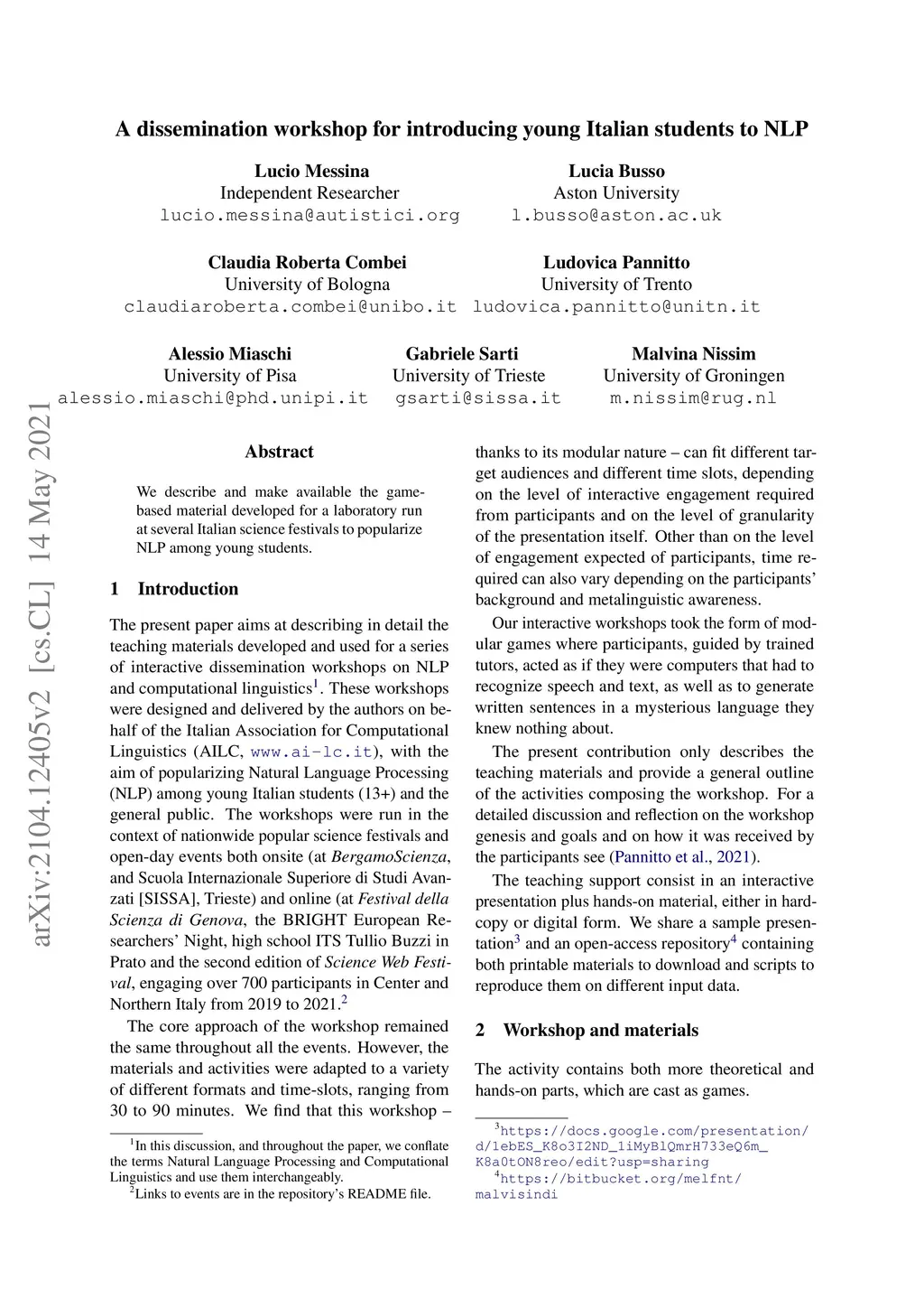 A dissemination workshop for introducing young Italian students to NLP