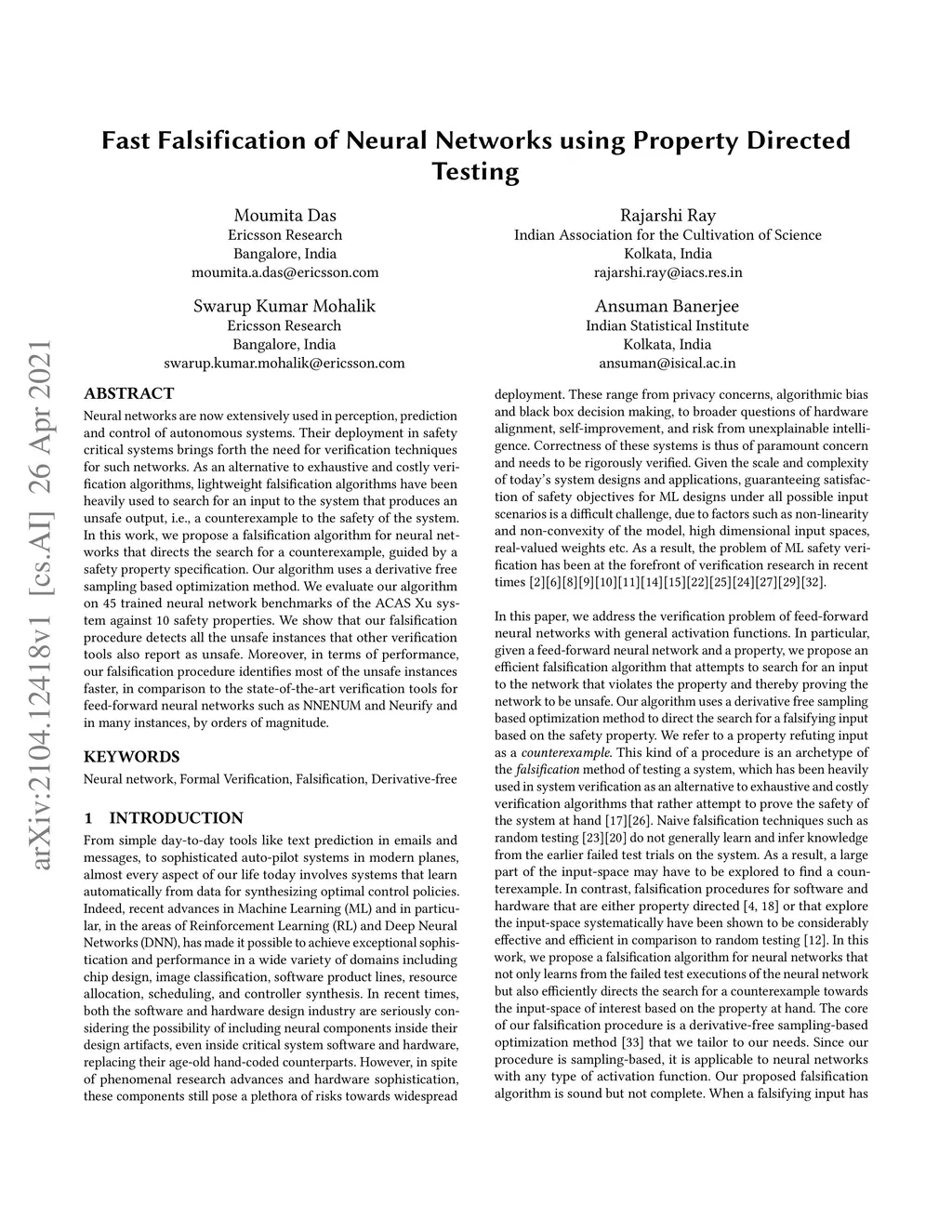 Neural networks are now extensively used in perception, prediction and control of autonomous systems. Their deployment in safety-critical systems brings forth the need for verification techniques for such networks. As an alternative to exhaustive and costly verification algorithms, lightweight falsification algorithms have been heavily used to search for an input to the system that produces an unsafe output, i.e., a counterexample to the safety of the system. In this work, we propose a falsification algorithm for neural networks that directs the search for a counterexample, guided by a safety property specification. Our algorithm uses a derivative-free sampling-based optimization method. We evaluate our algorithm on 45 trained neural network benchmarks of the ACAS Xu system against 10 safety properties. We show that our falsification procedure detects all the unsafe instances that other verification tools also report as unsafe. Moreover, in terms of performance, our falsification procedure identifies most of the unsafe instances faster, in comparison to the state-of-the-art verification tools for feed-forward neural networks such as NNENUM and Neurify and in many instances, by orders of magnitude.
