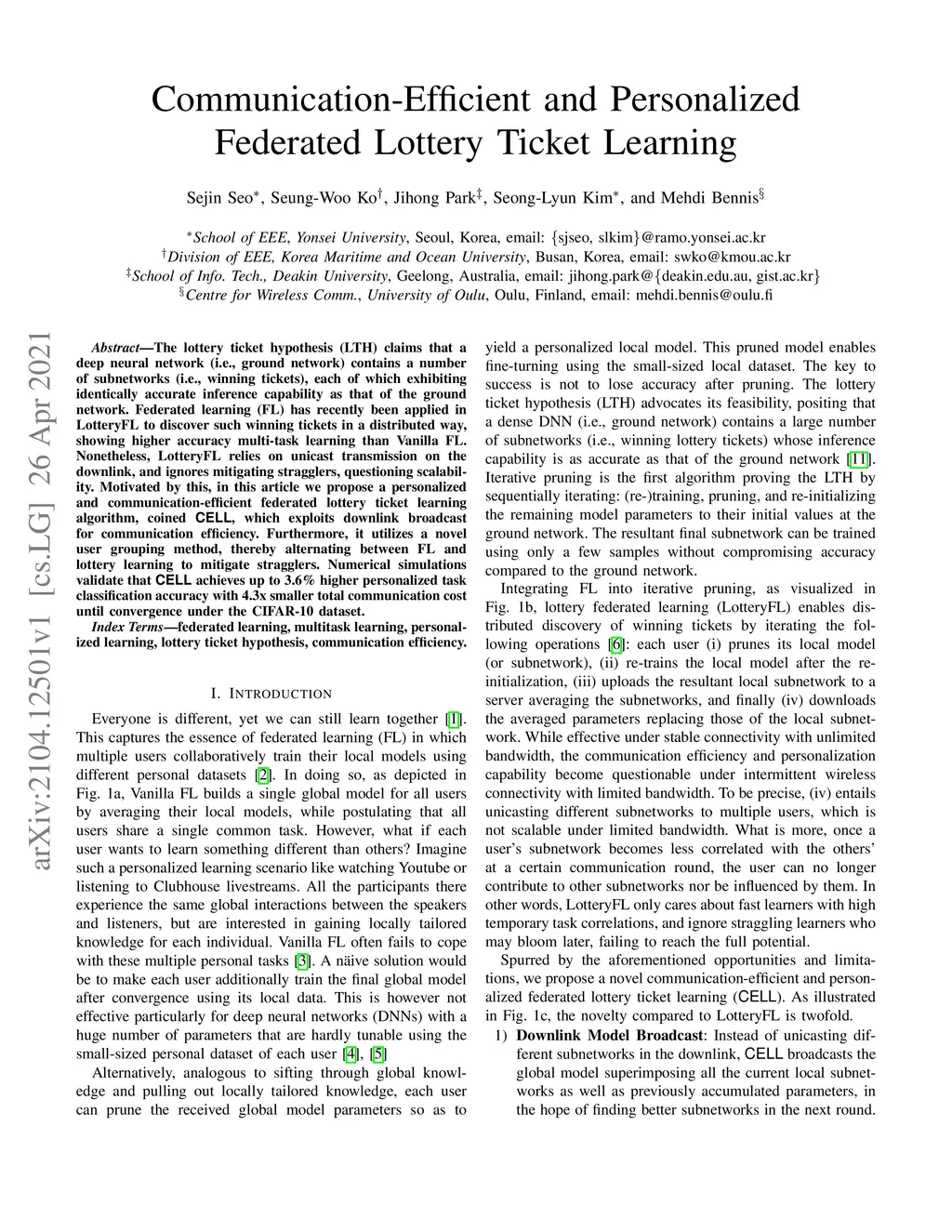 The lottery ticket hypothesis (LTH) claims that a deep neural network (i.e., ground network) contains a number of subnetworks (i.e., winning tickets), each of which exhibiting identically accurate inference capability as that of the ground network. Federated learning (FL) has recently been applied in LotteryFL to discover such winning tickets in a distributed way, showing higher accuracy multi-task learning than Vanilla FL. Nonetheless, LotteryFL relies on unicast transmission on the downlink, and ignores mitigating stragglers, questioning scalability. Motivated by this, in this article we propose a personalized and communication-efficient federated lottery ticket learning algorithm, coined CELL, which exploits downlink broadcast for communication efficiency. Furthermore, it utilizes a novel user grouping method, thereby alternating between FL and lottery learning to mitigate stragglers. Numerical simulations validate that CELL achieves up to 3.6% higher personalized task classification accuracy with 4.3x smaller total communication cost until convergence under the CIFAR-10 dataset.