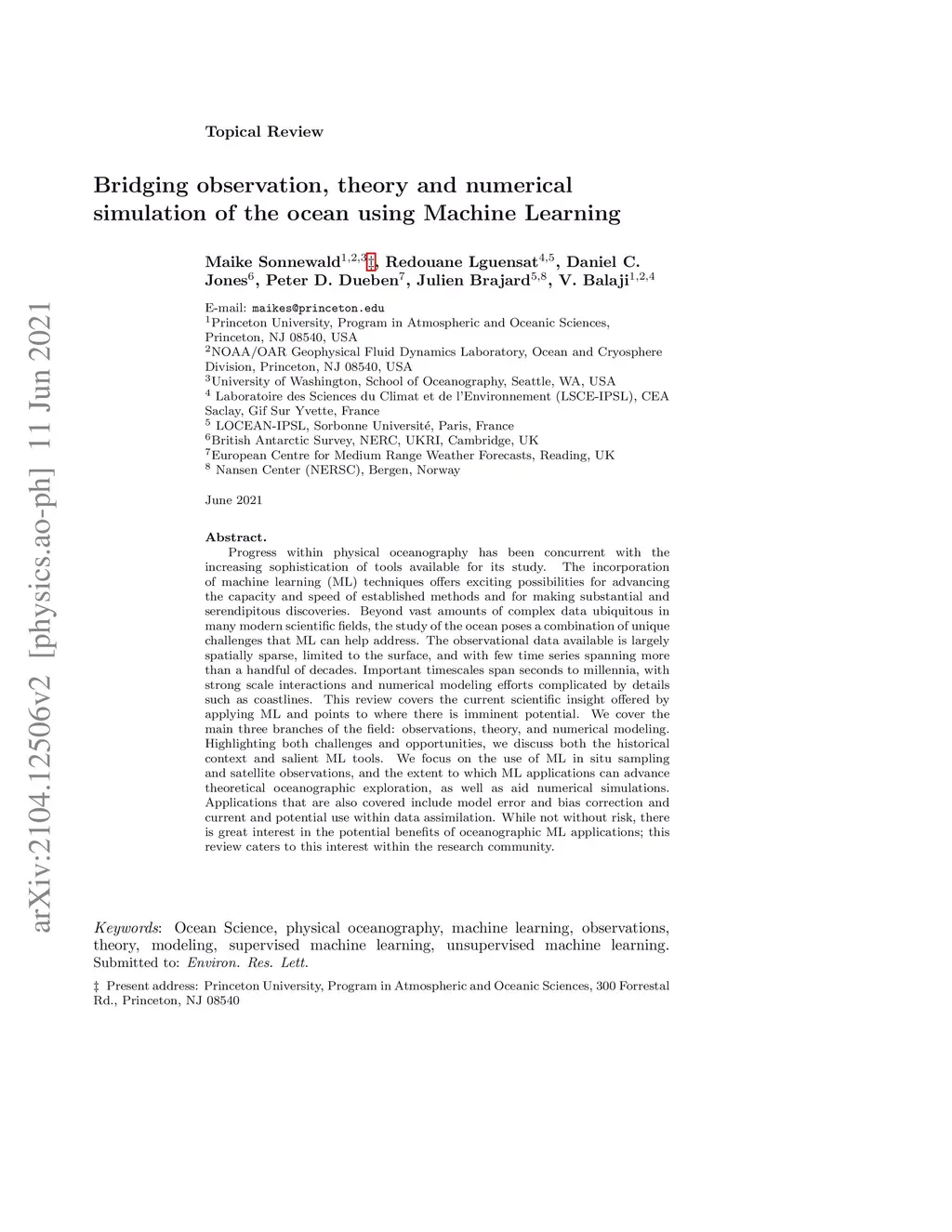 Progress within physical oceanography has been concurrent with the increasing sophistication of tools available for its study. The incorporation of machine learning (ML) techniques offers exciting possibilities for advancing the capacity and speed of established methods and also for making substantial and serendipitous discoveries. Beyond vast amounts of complex data ubiquitous in many modern scientific fields, the study of the ocean poses a combination of unique challenges that ML can help address. The observational data available is largely spatially sparse, limited to the surface, and with few time series spanning more than a handful of decades. Important timescales span seconds to millennia, with strong scale interactions and numerical modelling efforts complicated by details such as coastlines. This review covers the current scientific insight offered by applying ML and points to where there is imminent potential. We cover the main three branches of the field: observations, theory, and numerical modelling. Highlighting both challenges and opportunities, we discuss both the historical context and salient ML tools. We focus on the use of ML in situ sampling and satellite observations, and the extent to which ML applications can advance theoretical oceanographic exploration, as well as aid numerical simulations. Applications that are also covered include model error and bias correction and current and potential use within data assimilation. While not without risk, there is great interest in the potential benefits of oceanographic ML applications; this review caters to this interest within the research community.