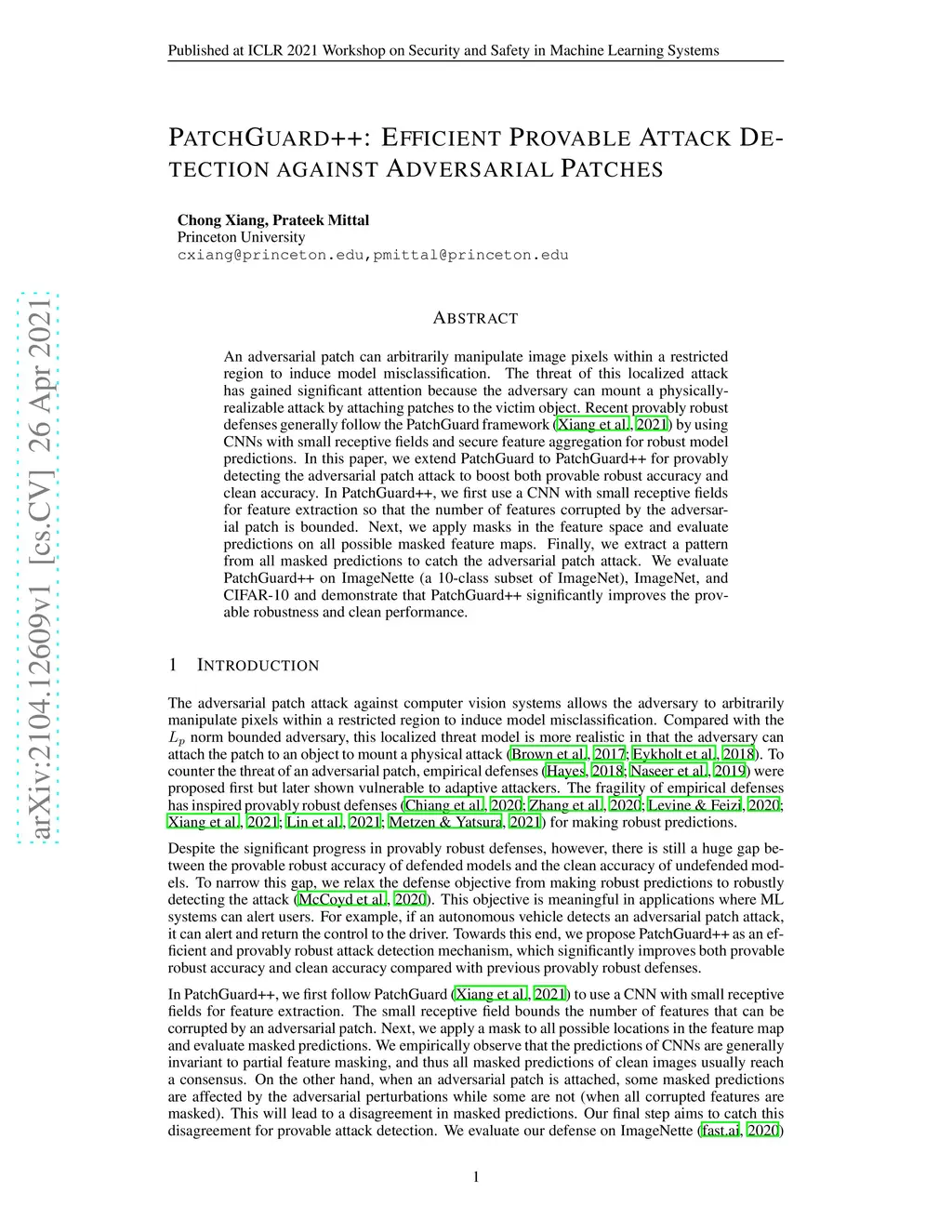 An adversarial patch can arbitrarily manipulate image pixels within a restricted region to induce model misclassification. The threat of this localized attack has gained significant attention because the adversary can mount a physically-realizable attack by attaching patches to the victim object. Recent provably robust defenses generally follow the PatchGuard framework by using CNNs with small receptive fields and secure feature aggregation for robust model predictions. In this paper, we extend PatchGuard to PatchGuard++ for provably detecting the adversarial patch attack to boost both provable robust accuracy and clean accuracy. In PatchGuard++, we first use a CNN with small receptive fields for feature extraction so that the number of features corrupted by the adversarial patch is bounded. Next, we apply masks in the feature space and evaluate predictions on all possible masked feature maps. Finally, we extract a pattern from all masked predictions to catch the adversarial patch attack. We evaluate PatchGuard++ on ImageNette (a 10-class subset of ImageNet), ImageNet, and CIFAR-10 and demonstrate that PatchGuard++ significantly improves the provable robustness and clean performance.