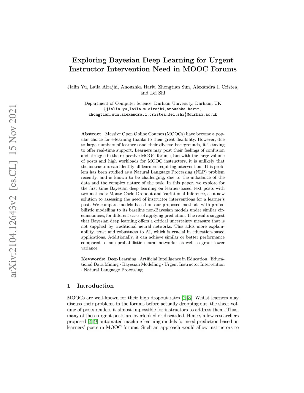 Massive Open Online Courses (MOOCs) have become a popular choice for e-learning thanks to their great flexibility. However, due to large numbers of learners and their diverse backgrounds, it is taxing to offer real-time support. Learners may post their feelings of confusion and struggle in the respective MOOC forums, but with the large volume of posts and high workloads for MOOC instructors, it is unlikely that the instructors can identify all learners requiring intervention. This problem has been studied as a Natural Language Processing (NLP) problem recently, and is known to be challenging, due to the imbalance of the data and the complex nature of the task. In this paper, we explore for the first time Bayesian deep learning on learner-based text posts with two methods: Monte Carlo Dropout and Variational Inference, as a new solution to assessing the need of instructor interventions for a learner's post. We compare models based on our proposed methods with probabilistic modelling to its baseline non-Bayesian models under similar circumstances, for different cases of applying prediction. The results suggest that Bayesian deep learning offers a critical uncertainty measure that is not supplied by traditional neural networks. This adds more explainability, trust and robustness to AI, which is crucial in education-based applications. Additionally, it can achieve similar or better performance compared to non-probabilistic neural networks, as well as grant lower variance.