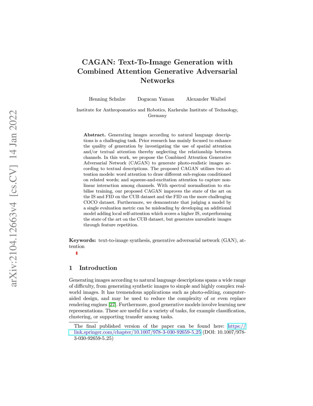 CAGAN: Text-To-Image Generation with Combined Attention GANs