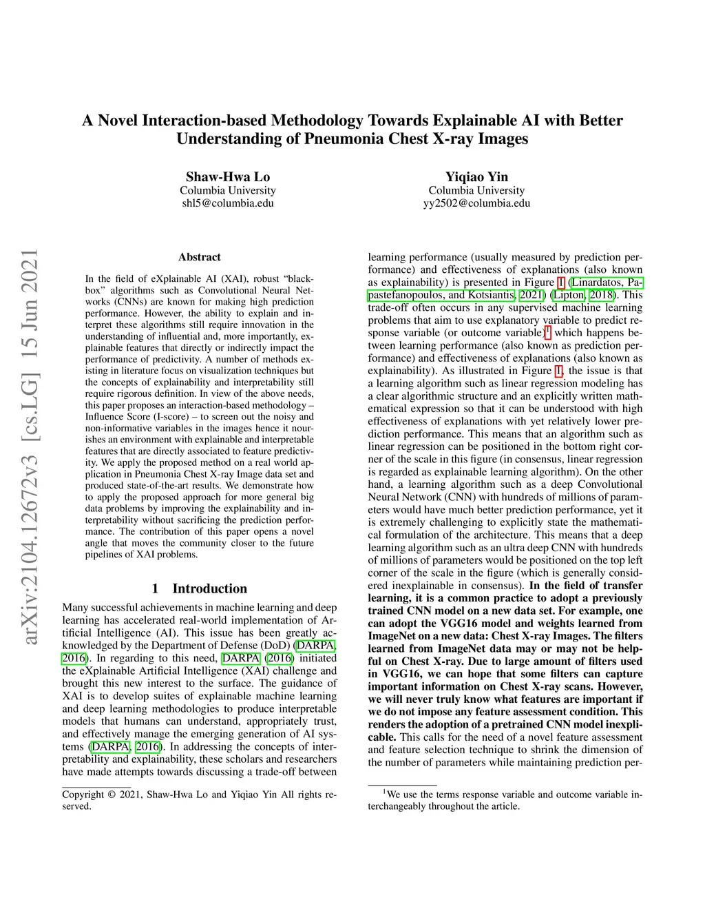 In the field of eXplainable AI (XAI), robust "blackbox" algorithms such as Convolutional Neural Networks (CNNs) are known for making high prediction performance. However, the ability to explain and interpret these algorithms still require innovation in the understanding of influential and, more importantly, explainable features that directly or indirectly impact the performance of predictivity. A number of methods existing in literature focus on visualization techniques but the concepts of explainability and interpretability still require rigorous definition. In view of the above needs, this paper proposes an interaction-based methodology -- Influence Score (I-score) -- to screen out the noisy and non-informative variables in the images hence it nourishes an environment with explainable and interpretable features that are directly associated to feature predictivity. We apply the proposed method on a real world application in Pneumonia Chest X-ray Image data set and produced state-of-the-art results. We demonstrate how to apply the proposed approach for more general big data problems by improving the explainability and interpretability without sacrificing the prediction performance. The contribution of this paper opens a novel angle that moves the community closer to the future pipelines of XAI problems.