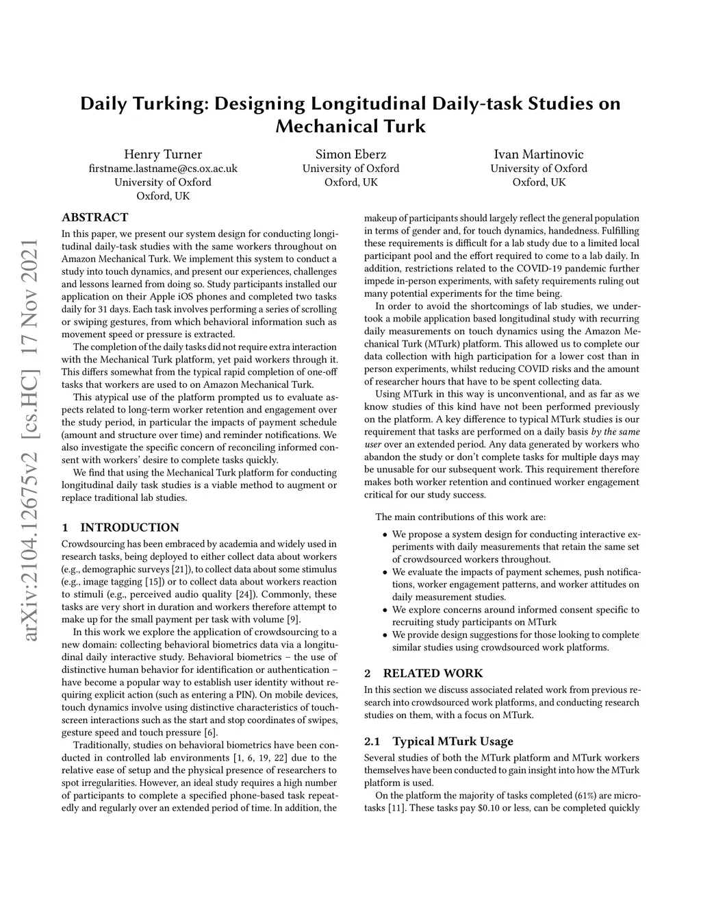 In this paper, we present our system design for conducting longitudinal daily-task studies with the same workers throughout on Amazon Mechanical Turk. We implement this system to conduct a study into touch dynamics, and present our experiences, challenges and lessons learned from doing so. Study participants installed our application on their Apple iOS phones and completed two tasks daily for 31 days. Each task involves performing a series of scrolling or swiping gestures, from which behavioral information such as movement speed or pressure is extracted. The completion of the daily tasks did not require extra interaction with the Mechanical Turk platform, yet paid workers through it. This differs somewhat from the typical rapid completion of one-off tasks that workers are used to on Amazon Mechanical Turk. This atypical use of the platform prompted us to evaluate aspects related to long-term worker retention and engagement over the study period, in particular the impacts of payment schedule (amount and structure over time) and reminder notifications. We also investigate the specific concern of reconciling informed consent with workers' desire to complete tasks quickly. We find that using the Mechanical Turk platform for conducting longitudinal daily task studies is a viable method to augment or replace traditional lab studies.