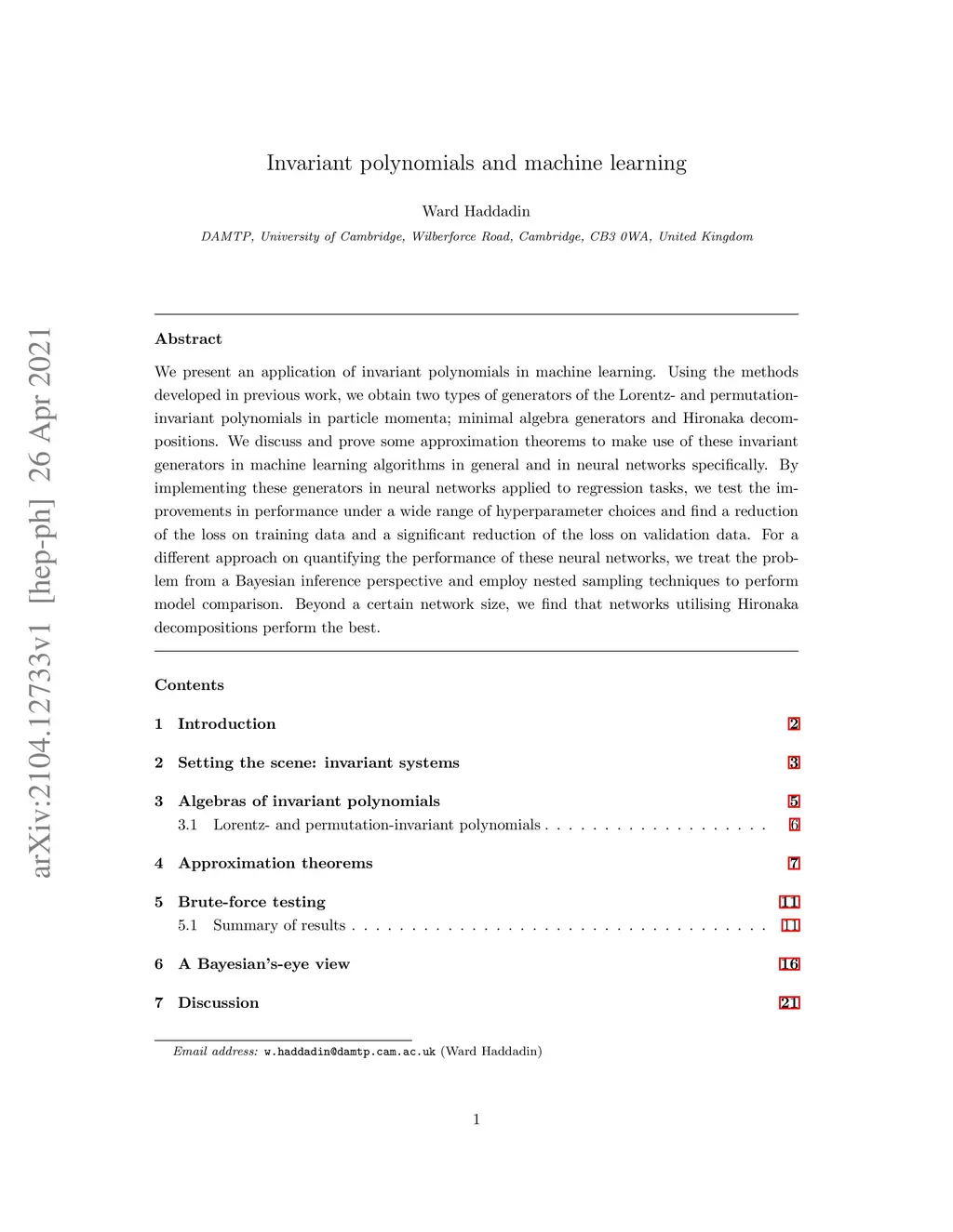 We present an application of invariant polynomials in machine learning. Using the methods developed in previous work, we obtain two types of generators of the Lorentz- and permutation-invariant polynomials in particle momenta; minimal algebra generators and Hironaka decompositions. We discuss and prove some approximation theorems to make use of these invariant generators in machine learning algorithms in general and in neural networks specifically. By implementing these generators in neural networks applied to regression tasks, we test the improvements in performance under a wide range of hyperparameter choices and find a reduction of the loss on training data and a significant reduction of the loss on validation data. For a different approach on quantifying the performance of these neural networks, we treat the problem from a Bayesian inference perspective and employ nested sampling techniques to perform model comparison. Beyond a certain network size, we find that networks utilising Hironaka decompositions perform the best.