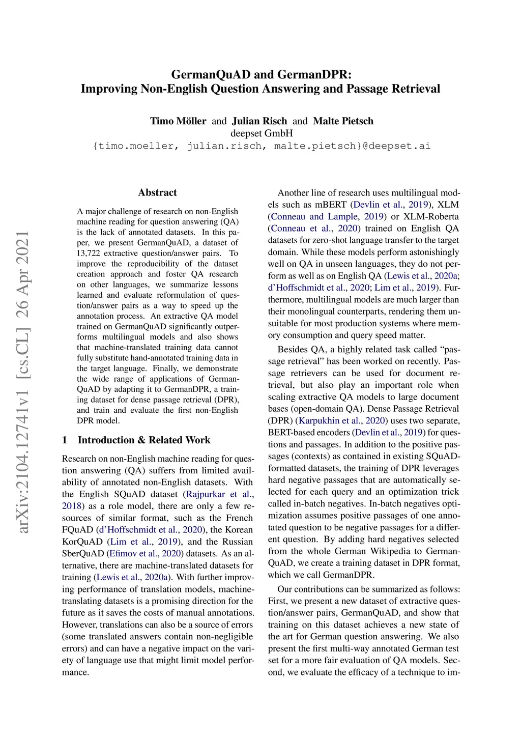 GermanQuAD and GermanDPR: Improving Non-English Question Answering and