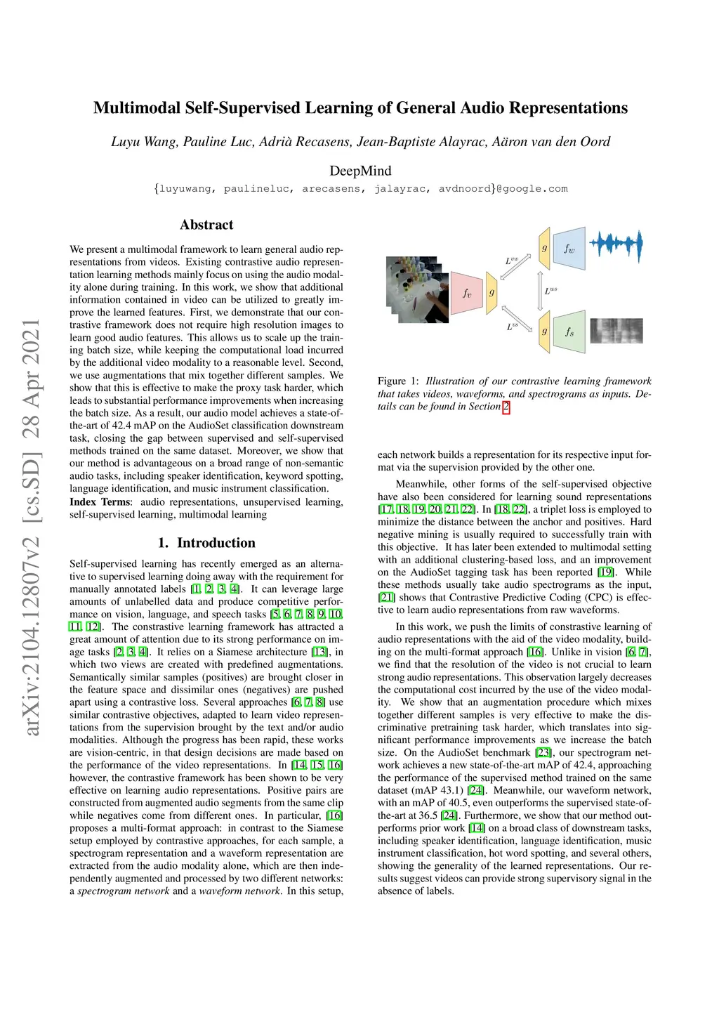 We present a multimodal framework to learn general audio representations from videos. Existing contrastive audio representation learning methods mainly focus on using the audio modality alone during training. In this work, we show that additional information contained in video can be utilized to greatly improve the learned features. First, we demonstrate that our contrastive framework does not require high resolution images to learn good audio features. This allows us to scale up the training batch size, while keeping the computational load incurred by the additional video modality to a reasonable level. Second, we use augmentations that mix together different samples. We show that this is effective to make the proxy task harder, which leads to substantial performance improvements when increasing the batch size. As a result, our audio model achieves a state-of-the-art of 42.4 mAP on the AudioSet classification downstream task, closing the gap between supervised and self-supervised methods trained on the same dataset. Moreover, we show that our method is advantageous on a broad range of non-semantic audio tasks, including speaker identification, keyword spotting, language identification, and music instrument classification.
