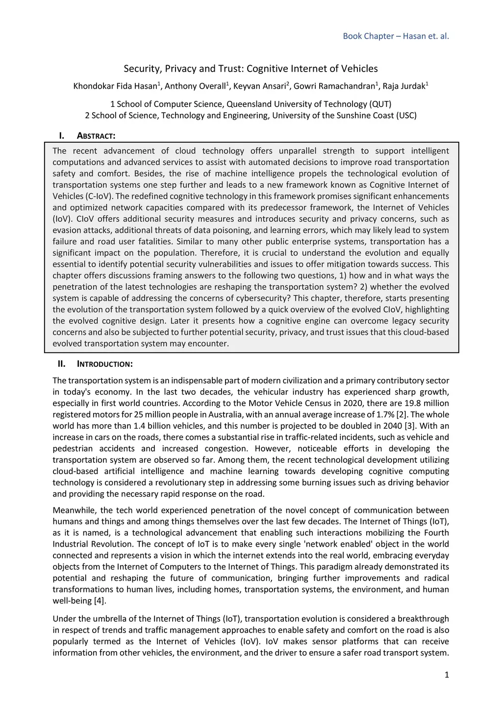 The recent advancement of cloud technology offers unparallel strength to support intelligent computations and advanced services to assist with automated decisions to improve road transportation safety and comfort. Besides, the rise of machine intelligence propels the technological evolution of transportation systems one step further and leads to a new framework known as Cognitive Internet of Vehicles (C-IoV). The redefined cognitive technology in this framework promises significant enhancements and optimized network capacities compared with its predecessor framework, the Internet of Vehicles (IoV). CIoV offers additional security measures and introduces security and privacy concerns, such as evasion attacks, additional threats of data poisoning, and learning errors, which may likely lead to system failure and road user fatalities. Similar to many other public enterprise systems, transportation has a significant impact on the population. Therefore, it is crucial to understand the evolution and equally essential to identify potential security vulnerabilities and issues to offer mitigation towards success. This chapter offers discussions framing answers to the following two questions, 1) how and in what ways the penetration of the latest technologies are reshaping the transportation system? 2) whether the evolved system is capable of addressing the concerns of cybersecurity? This chapter, therefore, starts presenting the evolution of the transportation system followed by a quick overview of the evolved CIoV, highlighting the evolved cognitive design. Later it presents how a cognitive engine can overcome legacy security concerns and also be subjected to further potential security, privacy, and trust issues that this cloud-based evolved transportation system may encounter.